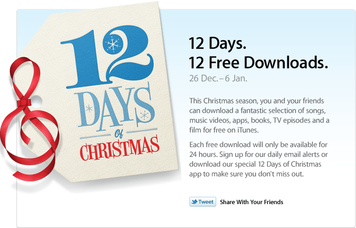 ช่วงเทศกาลคริสมาสต์ปี 2010 ที่ใกล้จะถึงนี้ก็เป็นอีกปีที่หลายๆคนคงจะได้รับความสุขกันไปตามกันๆ ปีนี้พิเศษอีกอย่างที่เพิ่มเข้ามาคือ Apple จะทำการแจกของขวัญให้กับลูกค้าผู้ใช้ iPhone, iPod Touhc, iPad, iTunes ต่างๆหลายรายการ รวมระยะเวลาทั้งหมด 12 วันเริ่มตั้งแต่วันที่ 26 ธค. 2010 – 6 มค. 2011 ซึ่งต้องติดตามกันว่าแต่ละวันนั้นจะแจกอะไรฟรีกันบ้าง