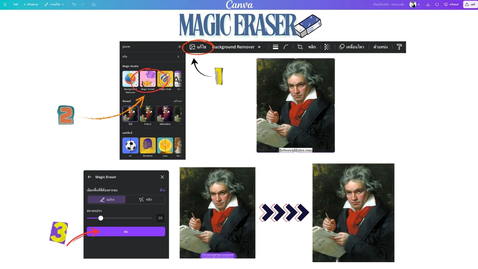 - ระบายส่วนที่ต้องการลบออก และ Magic Eraser จะลบวัตถุนั้นออกจากภาพให้โดยอัตโนมัติ