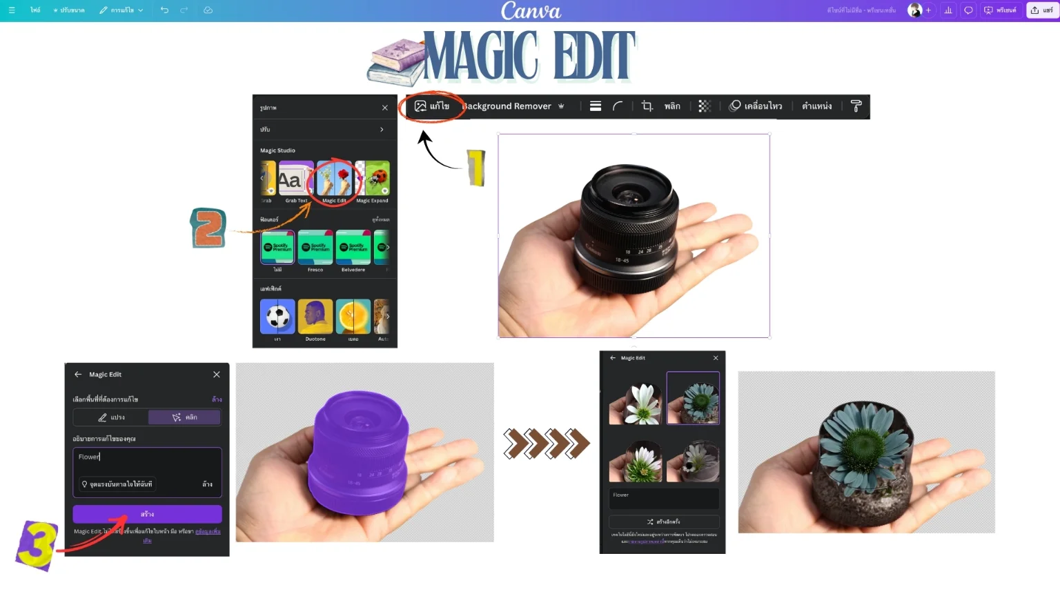 - Magic Edit : ปรับแต่งภาพโดยการเพิ่ม ลบ หรือแก้ไขวัตถุในภาพได้อย่างง่ายดาย เพียงแค่เลือกวัตถุที่ต้องการแก้ไข และใช้ AI เพื่อแก้ไขตามที่คุณต้องการ เช่น เพิ่มวัตถุใหม่ลงไปในภาพหรือลบวัตถุที่ไม่ต้องการออก