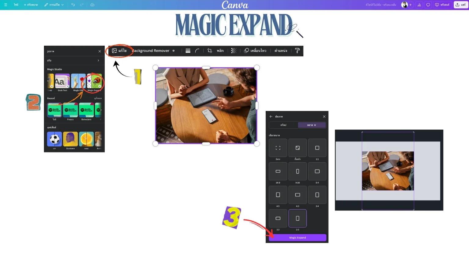 - เลือก Magic Expand : ขยายภาพในทิศทางที่ต้องการ เช่น แนวตั้งหรือแนวนอน เพื่อให้เข้ากับดีไซน์ที่กำหนด