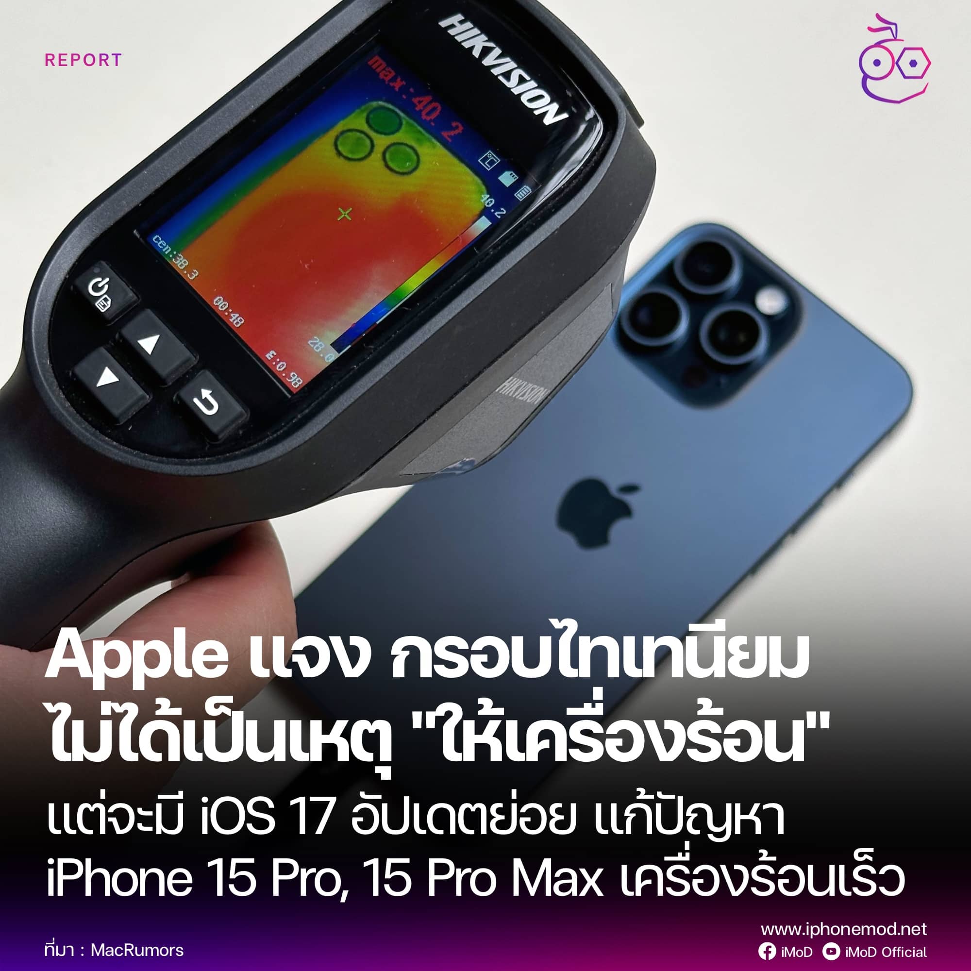 ล่าสุด MacRumors รายงานข้อมูลอ้างอิงจาก Apple เผยว่าปัญหาเครื่องร้อนไวของ iPhone 15 Pro, 15 Pro Max นั้นไม่ได้เกี่ยวกับกรอบไทเทเนียมและดีไซน์ภายในของตัวเครื่อง! โดย Apple เผยว่าจริง ๆ แล้วทั้งกรอบไทเทเนียมและอะลูมิเนียม ระบายความร้อนได้ดีกว่าสแตนเลสด้วยซ้ำ