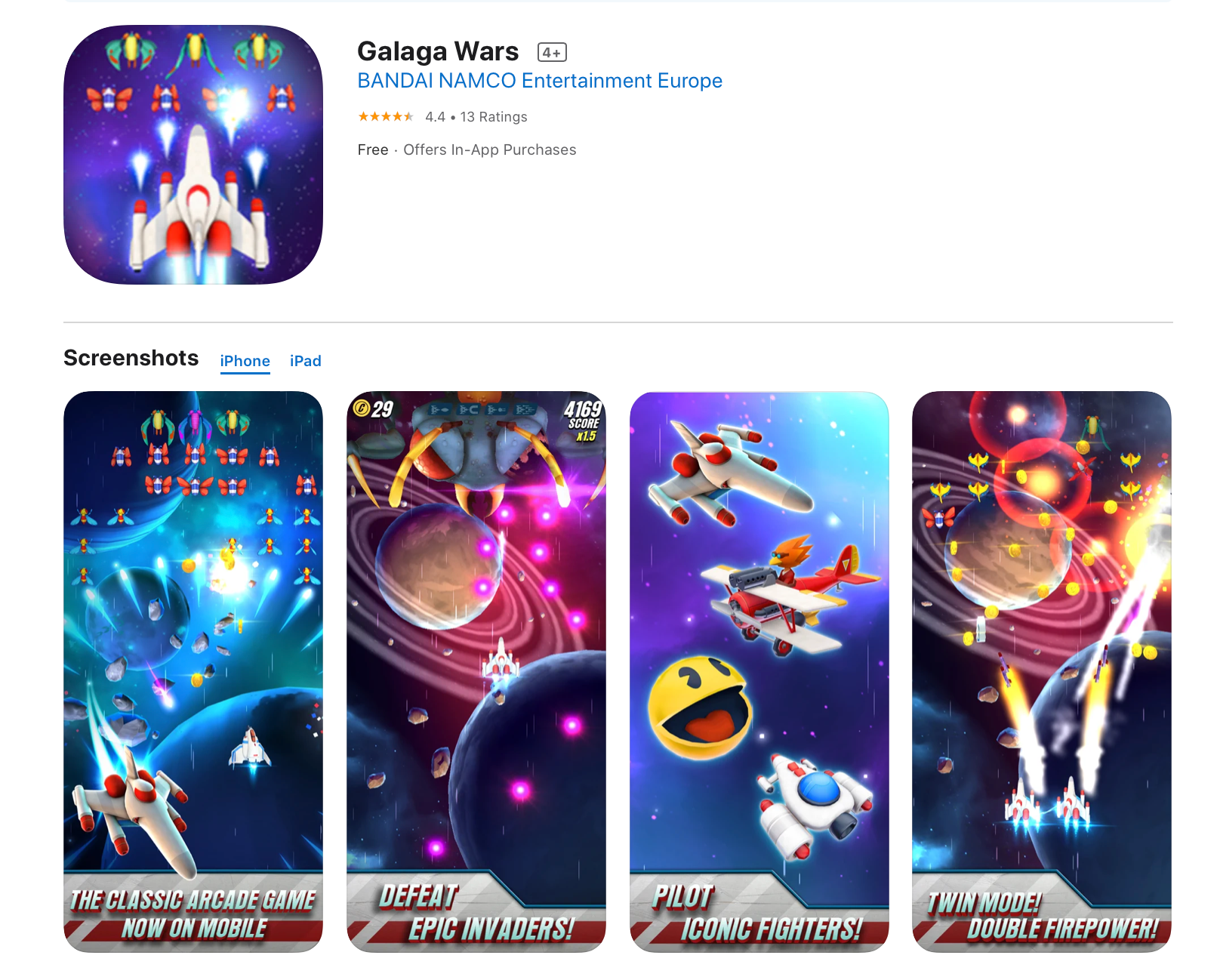 Galaga Wars จาก BANDAI NAMCO เป็นเกมอาเขตแนวชู้ตเตอร์สุดคลาสสิกที่มาพร้อมกับกราฟิกที่สวยงามและการควบคุมบนหน้าจอสัมผัสที่แสนง่าย ผู้เล่นจะได้ย้อนอดีตไปกับเกมยอดฮิตที่หลาย ๆ คนเคยเล่น โดยจะต้องปกป้องกาแล็กซี่ของเราไม่ให้เหล่าเอเลี่ยนผ่านไปได้ด้วยปืนเลเซอร์และจรวดมิสไซล์ขนาดใหญ่