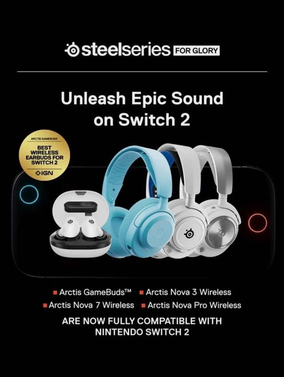 SteelSeries ในฐานะผู้นำด้านอุปกรณ์เสียงสำหรับเกมเมอร์ระดับโลก ได้ประกาศอย่างเป็นทางการแล้วว่า หูฟังยอดนิยมไม่ว่าจะเป็น Arctis GameBuds, Arctis Nova 3 Wireless, Nova 7 Wireless และ Nova Pro Wireless พร้อมรองรับการเชื่อมต่ออย่างสมบูรณ์แบบกับ Nintendo Switch 2 ผ่าน Bluetooth และดองเกิลไร้สายความถี่ 2.4GHz