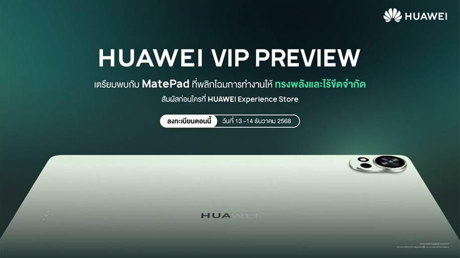ผู้ที่สนใจสามารถร่วมสัมผัสความล้ำสมัยของ HUAWEI MatePad แท็บเล็ตรุ่นใหม่ได้ก่อนใครที่กิจกรรม “HUAWEI VIP Preview: Pre-Experience & Discover HUAWEI” ระหว่างวันที่ 13–14 ธันวาคม 2568 ที่ HUAWEI Authorized Experience Store รวม 16 สาขาทั่วกรุงเทพฯ และปริมณฑล