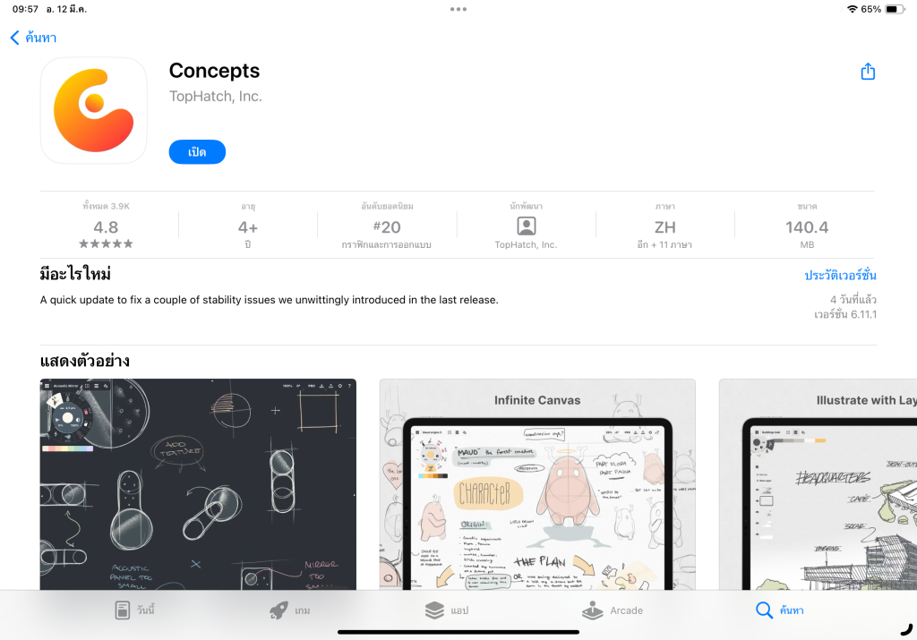 Concepts เป็นแอปวาดรูปที่เน้นความเรียบง่าย เหมาะสำหรับการร่างภาพและสเก็ตช์ไอเดีย แอปนี้มีเครื่องมือวาดรูปพื้นฐาน รองรับการทำงานกับเลเยอร์ และสามารถส่งออกไฟล์เป็น PDF ได้