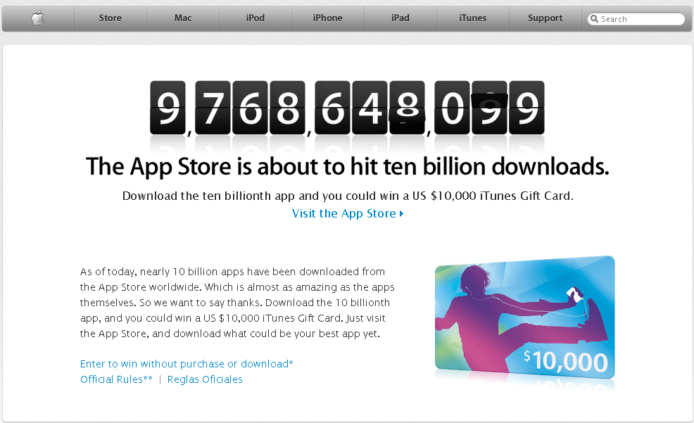 “เป็นที่รู้กันว่า AppStore ของ Apple เปิดให้ดาวน์โหลดกันได้ทั่วโลก และ ณ ปัจจุบันยอดการดาวน์โหลดก็ใกล้ครบ 10000 ล้านแอพเข้าไปทุกที Apple จึงจัดกิจกรรมนี้ขึ้นมาเพื่อเป็นการตอบแทนลูกค้าทั่วโลก โดยมีกติกาง่ายๆ คือ ใครเป็นคนโหลด app ครั้งที่ หนึ่งหมื่นล้าน รับ Gift Card ไปชอปปิ้งใน Appstore ฟรี US $10,000