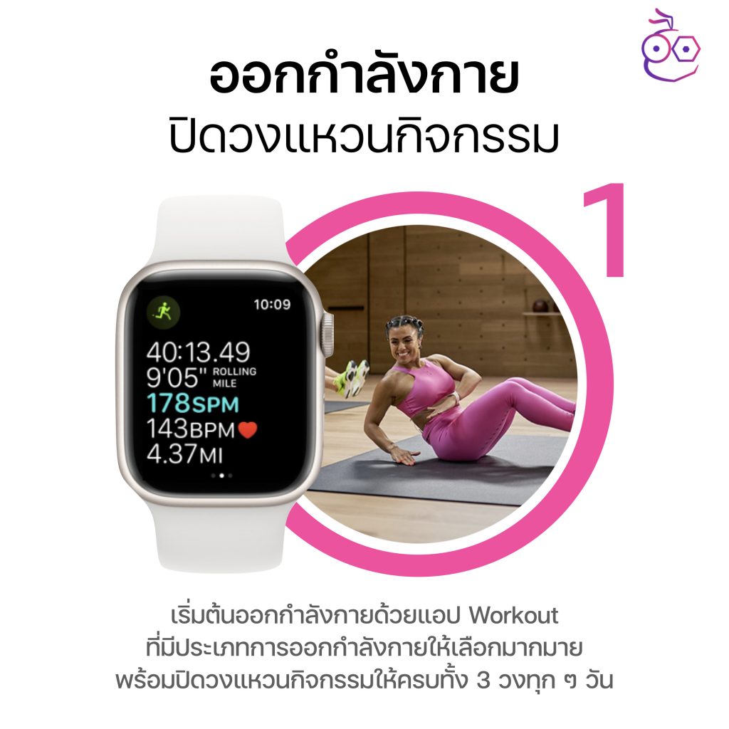 เริ่มต้นออกกำลังกายด้วยแอปออกกำลังกาย (Workout) ที่มีประเภทการออกกำลังกายให้เลือกมากมาย Apple Watch จะช่วยติดตามข้อมูลกำลังกายของเรา ไม่ว่าจะเป็นอัตราการเต้นของหัวใจ พลังงานที่ร่างกายเผาผลาญ ถ้าหากเป็นการวิ่ง เดิน ปั่นจักรยาน ว่ายน้ำ ก็จะมีการติดตามระยะทางรวมถึงข้อมูลที่เกี่ยวข้ออื่น ๆ ด้วย