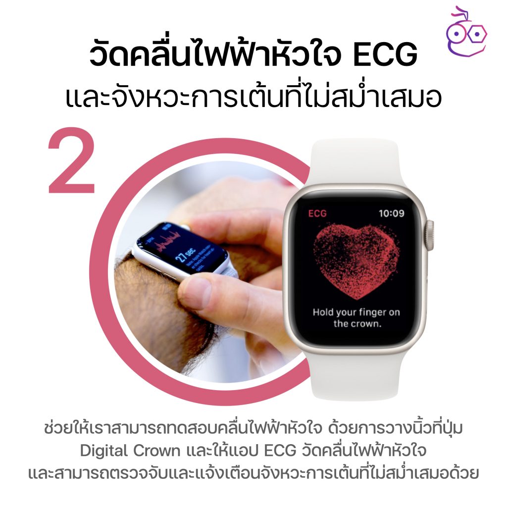 ฟีเจอร์ ECG นั้นมาพร้อมกับ Apple Watch Series 4 ที่ช่วยให้เราสามารถทดสอบคลื่นไฟฟ้าหัวใจ (ECG) ด้วยการวางนิ้วที่ปุ่ม Digital Crown และให้แอป ECG วัดคลื่นไฟฟ้าหัวใจ ทำงานร่วมกับเซ็นเซอร์ตรวจคลื่นไฟฟ้าหัวใจ (ECG) ที่ติดตั้งมาในเครื่อง [ชมวิธี]