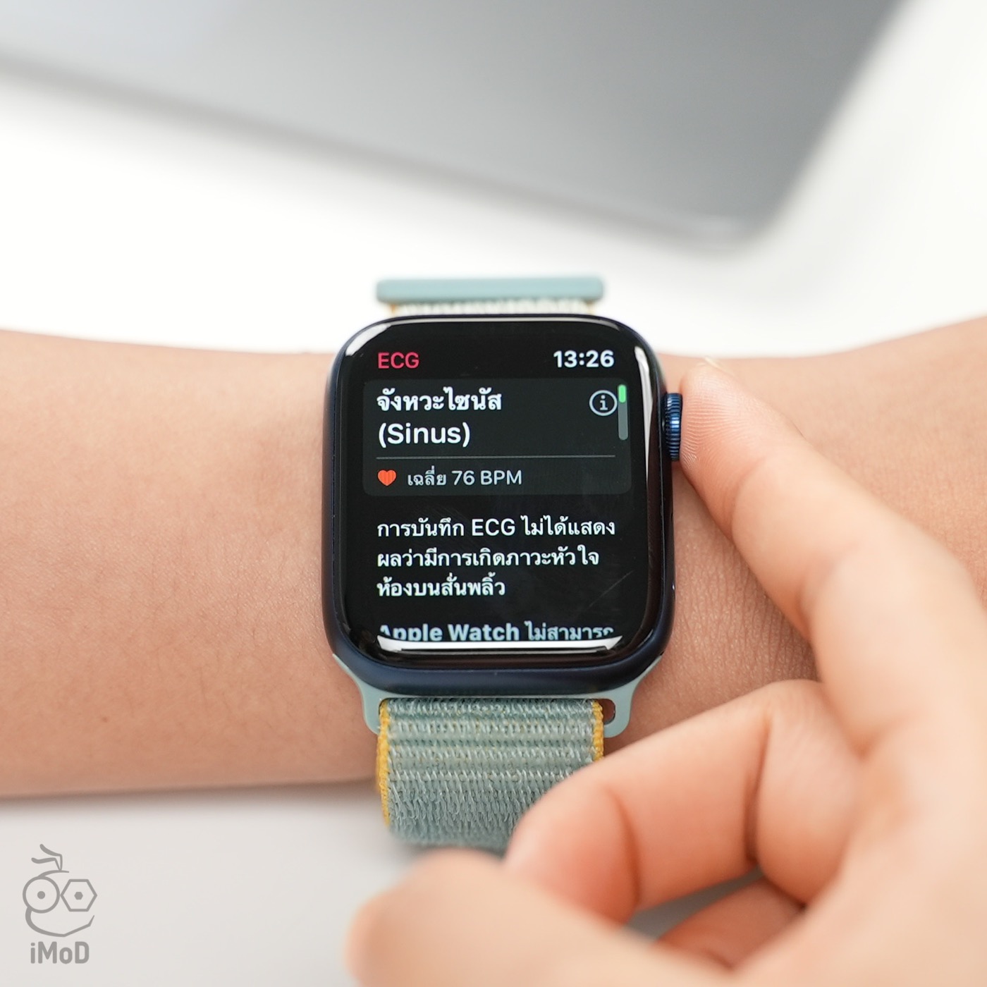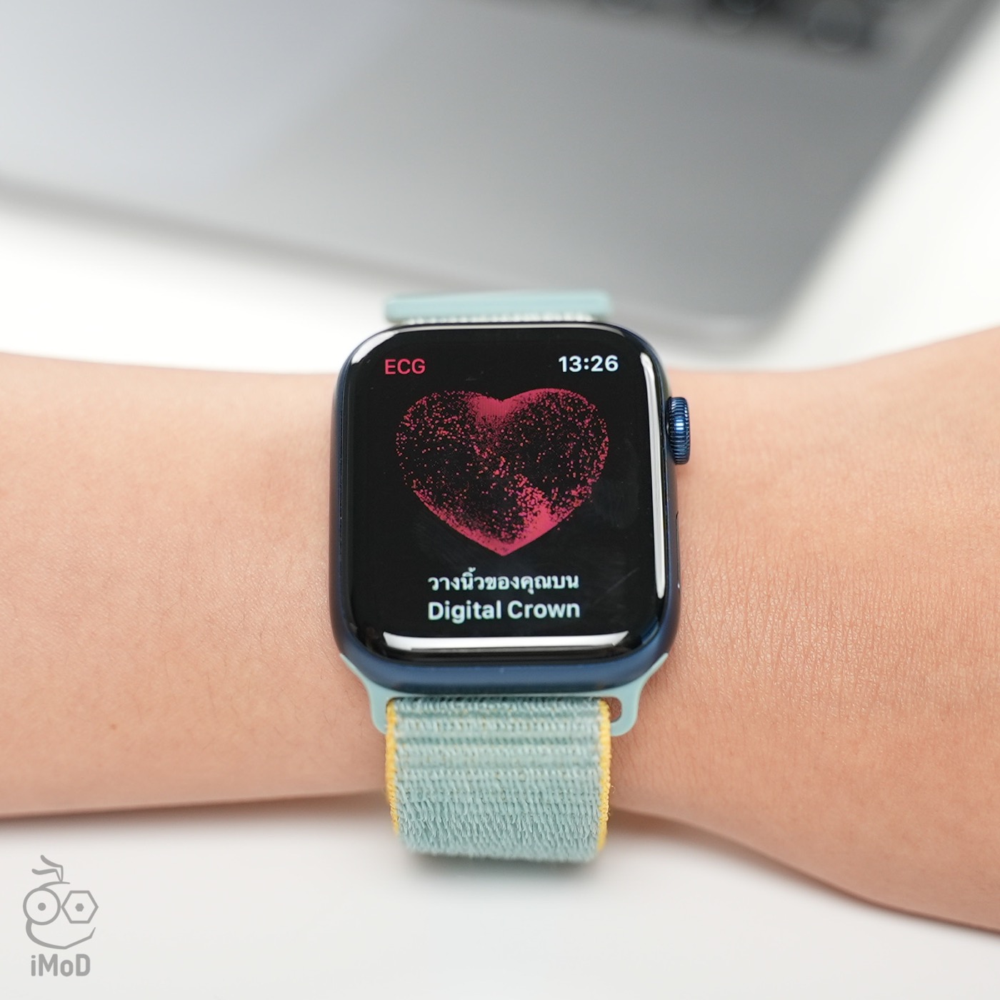 - มือข้างที่ไม่ได้สวมนาฬิกา ให้วางนิ้วลงบน Digital Crown (วงจรปิดจะถูกสร้างขึ้นระหว่างหัวใจกับแขนทั้งสองข้างเพื่อตรวจจับคลื่นไฟฟ้าตลอดช่วงอก) ค้างไว้แล้วรอในขณะที่ Apple Watch บันทึก ECG