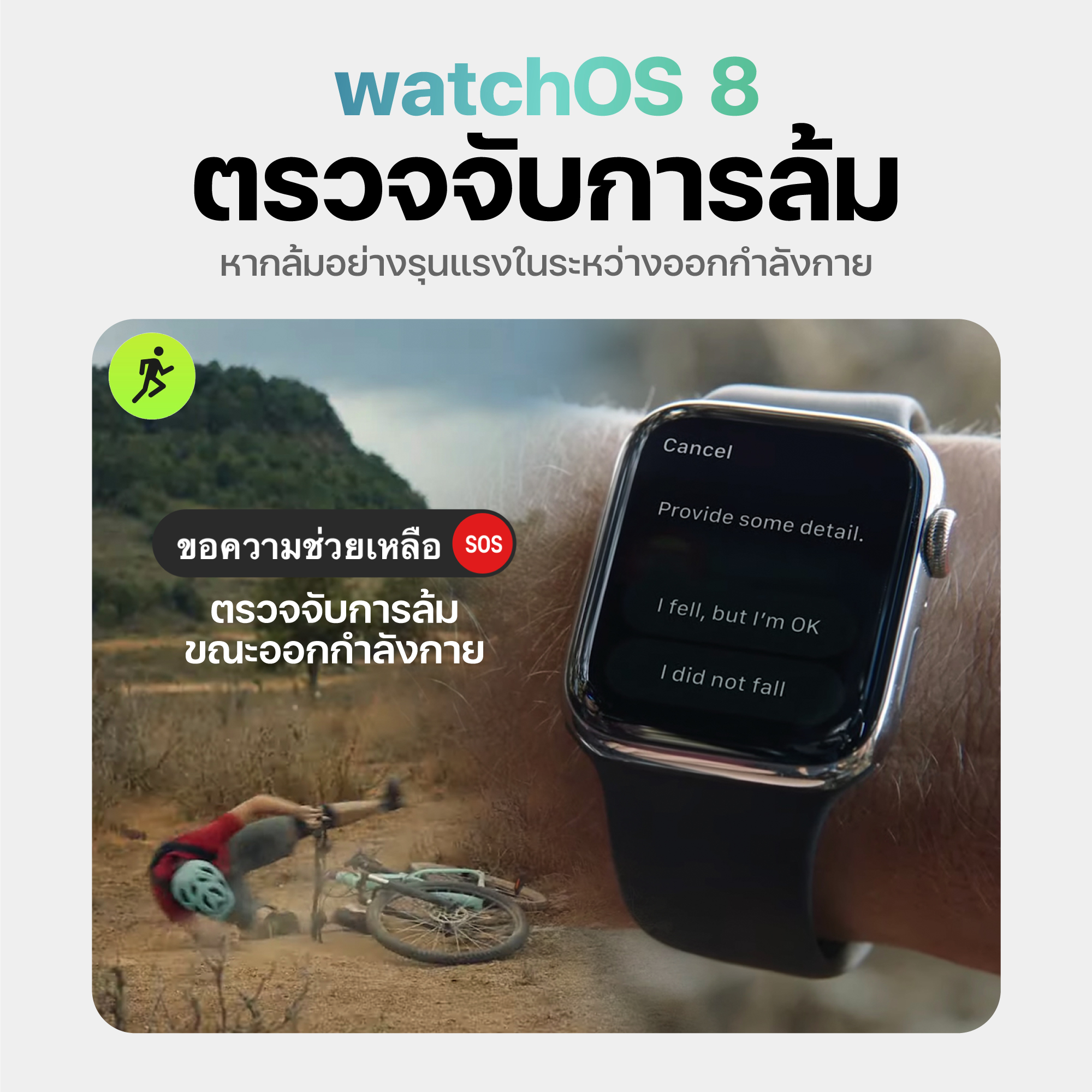 Apple Watch SE หรือ Apple Watch Series 4 หรือใหม่กว่า สามารถตรวจจับพบการล้มอย่างรุนแรงได้ และ Apple Watch จะติดต่อบริการฉุกเฉินให้หากเราต้องการ