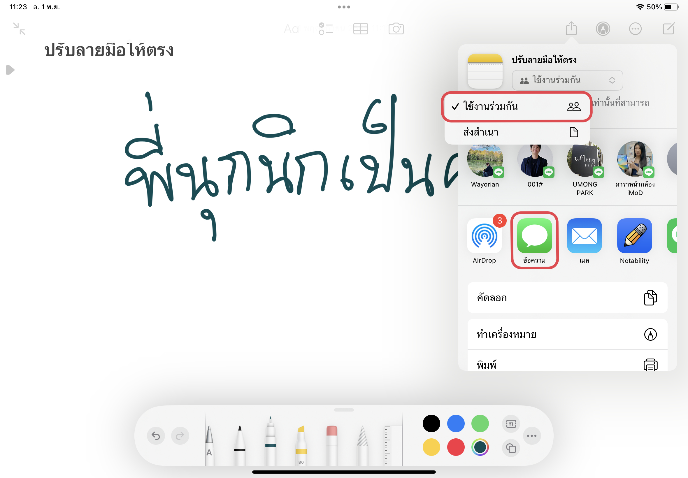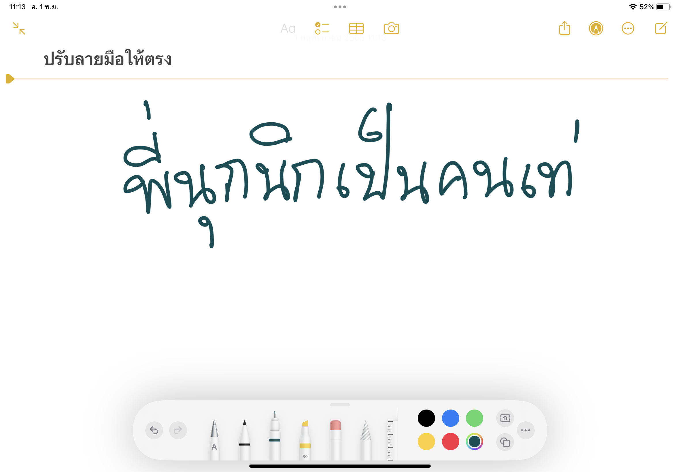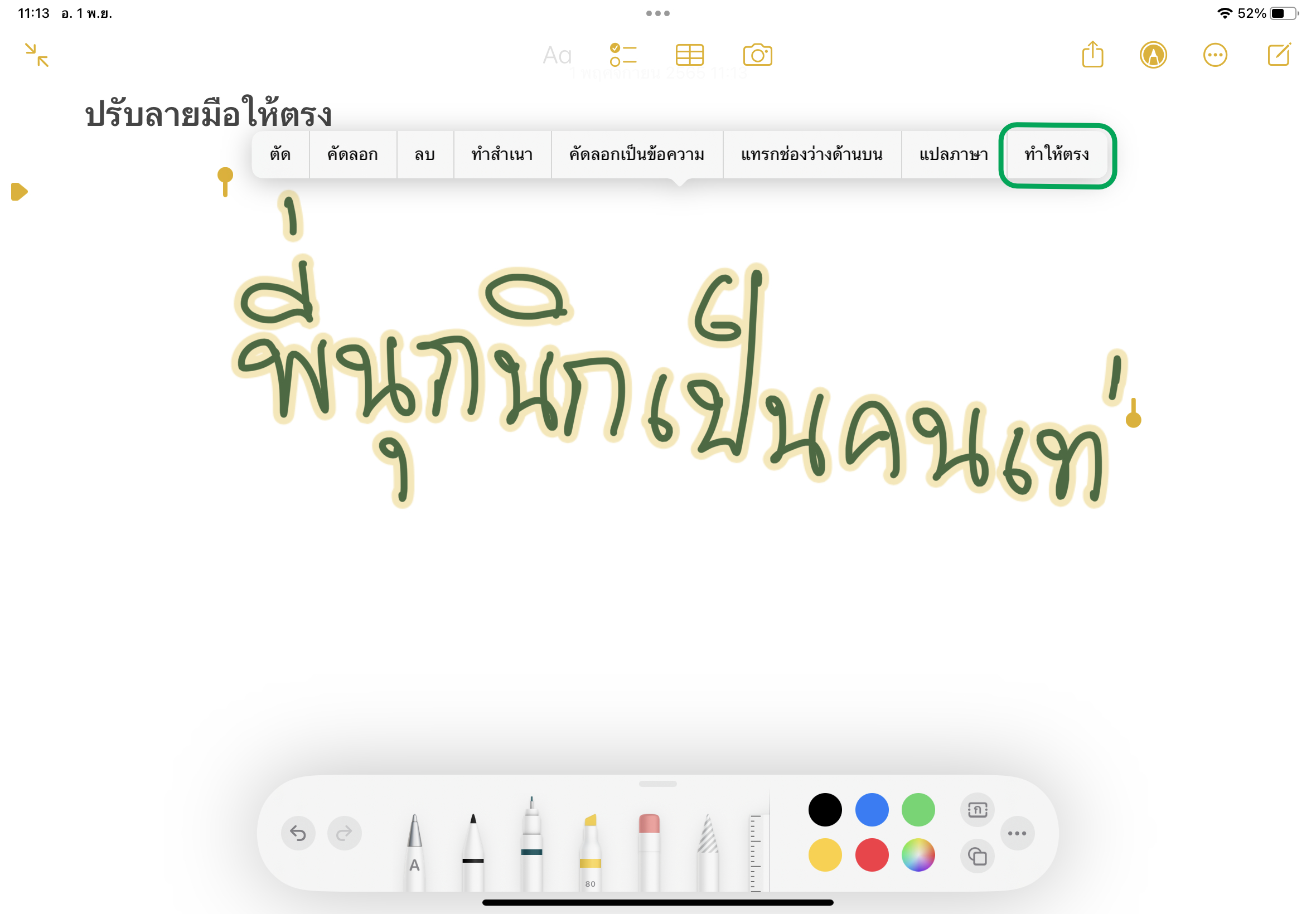 วิธีการคือ ลากคลุมลายมือที่เขียน > เลือกเมนู “ทำให้ตรง” > ลายมือของเราก็จะถูกปรับให้ตรงและเป็นระเบียบมากขึ้นในทันที