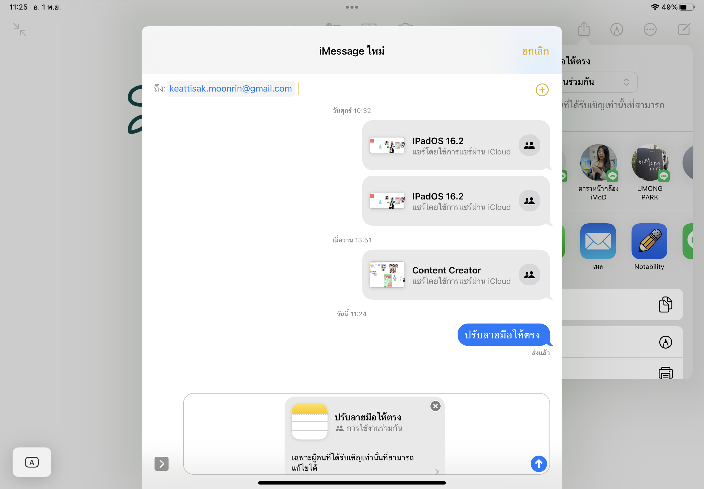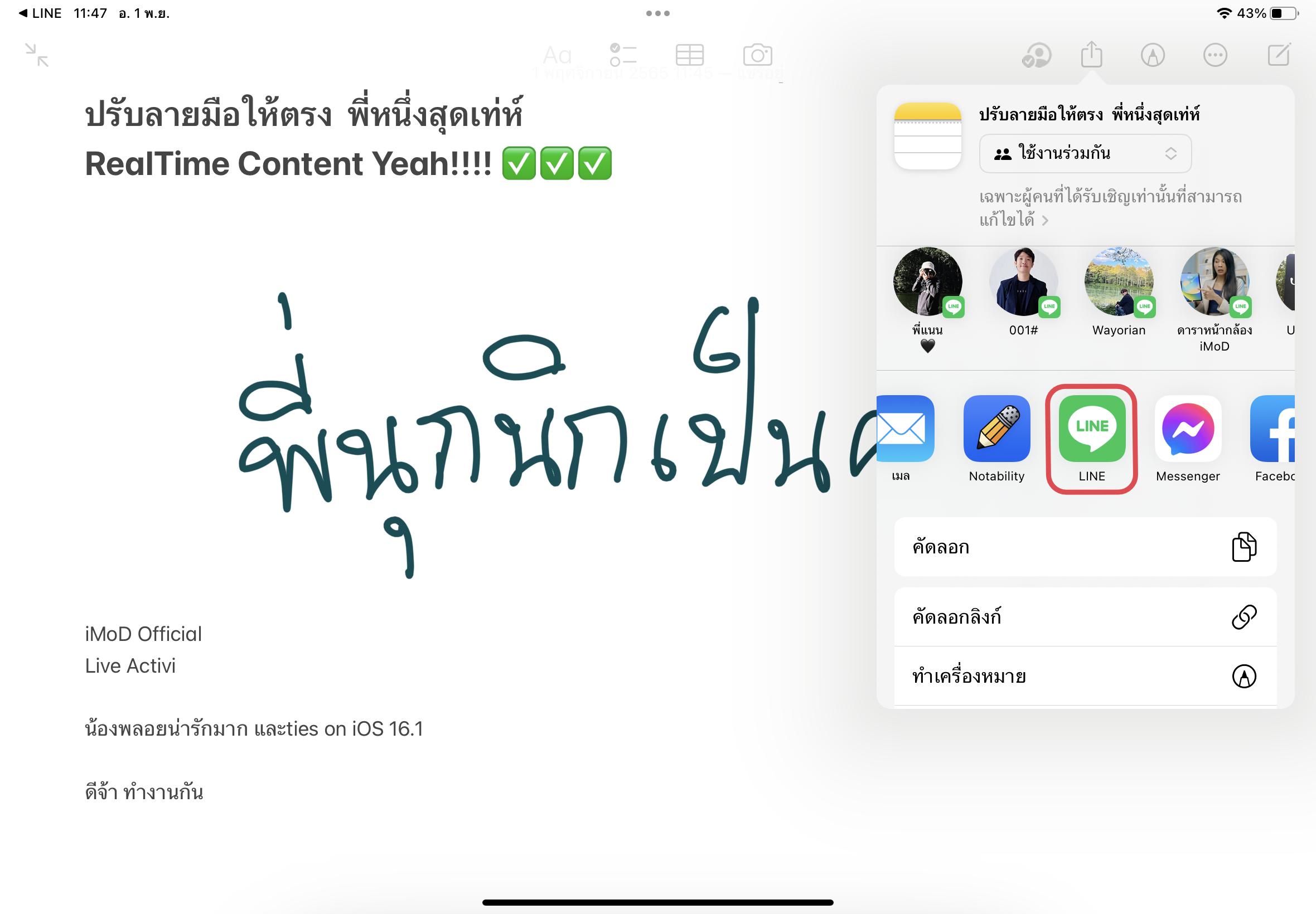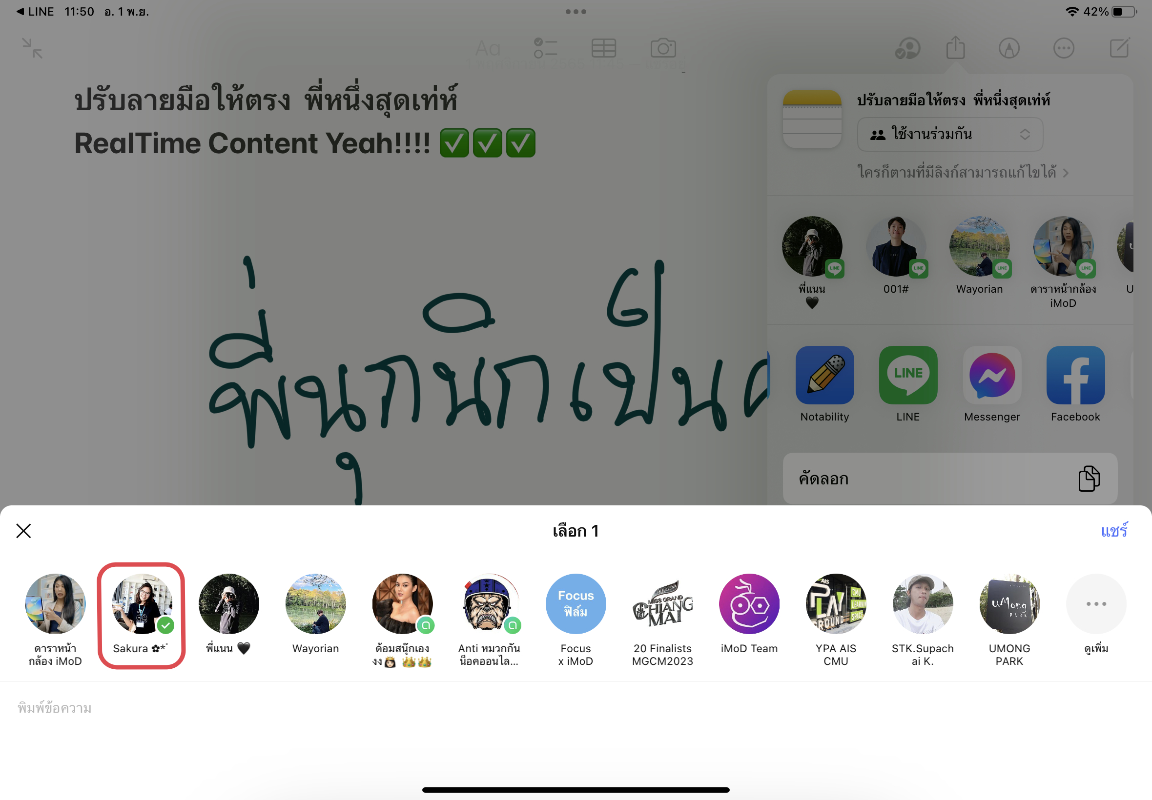วิธีที่ 1 แชร์โน้ตไปยังแอปข้อความ แตะที่ไอคอนแชร์ > เลือก “ใช้งานร่วมกัน” > แตะที่ไอคอนแอปข้อความ > เลือกเพื่อน > กดแชร์ได้เลย