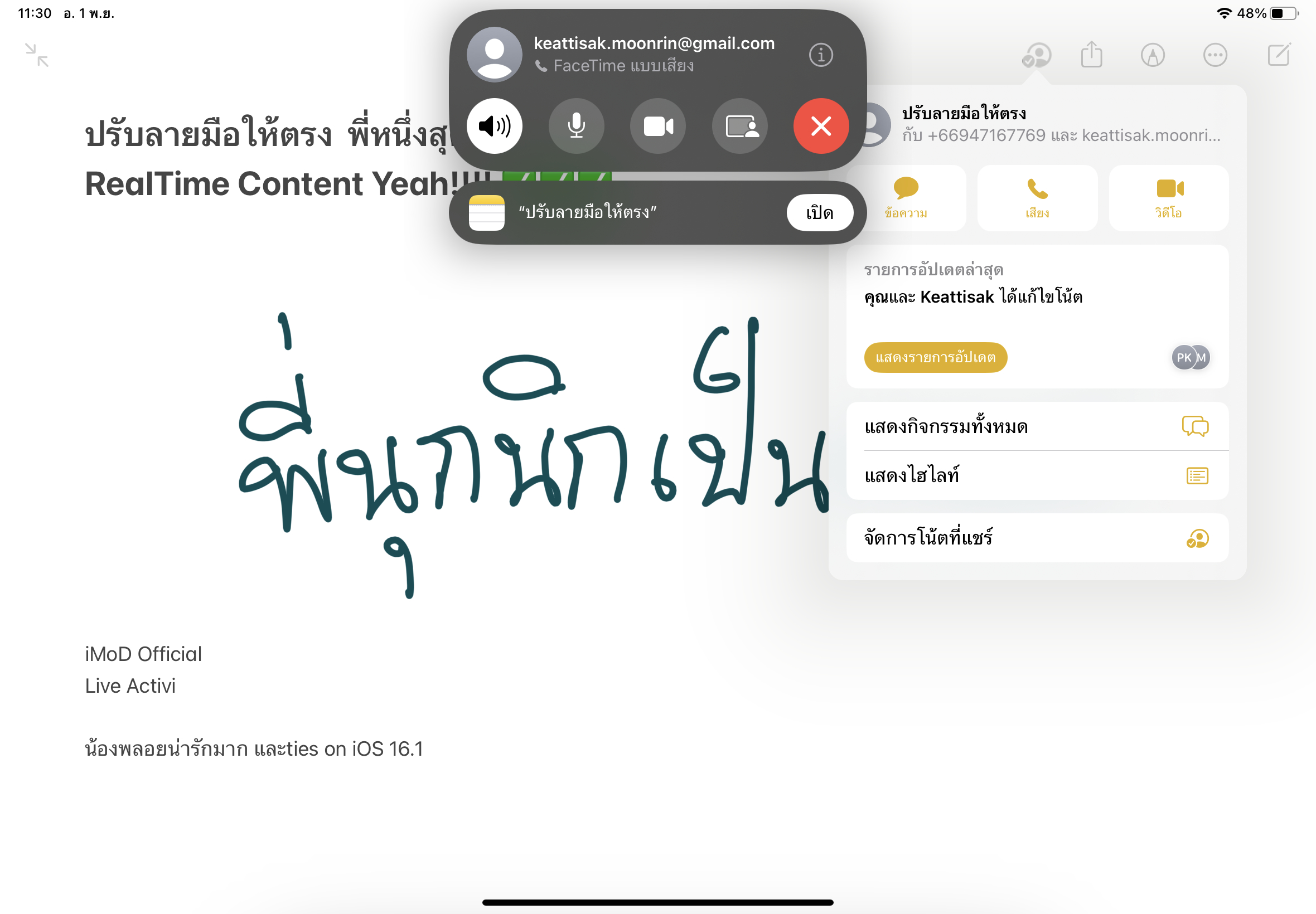 นอกจากการแชร์ผ่านลิงก์แล้ว เรายังสามารถโทร FaceTime แบบเสียงหรือวิดีโอคอลไปพร้อมๆ กับการแก้ไขงานร่วมกันได้เลย
