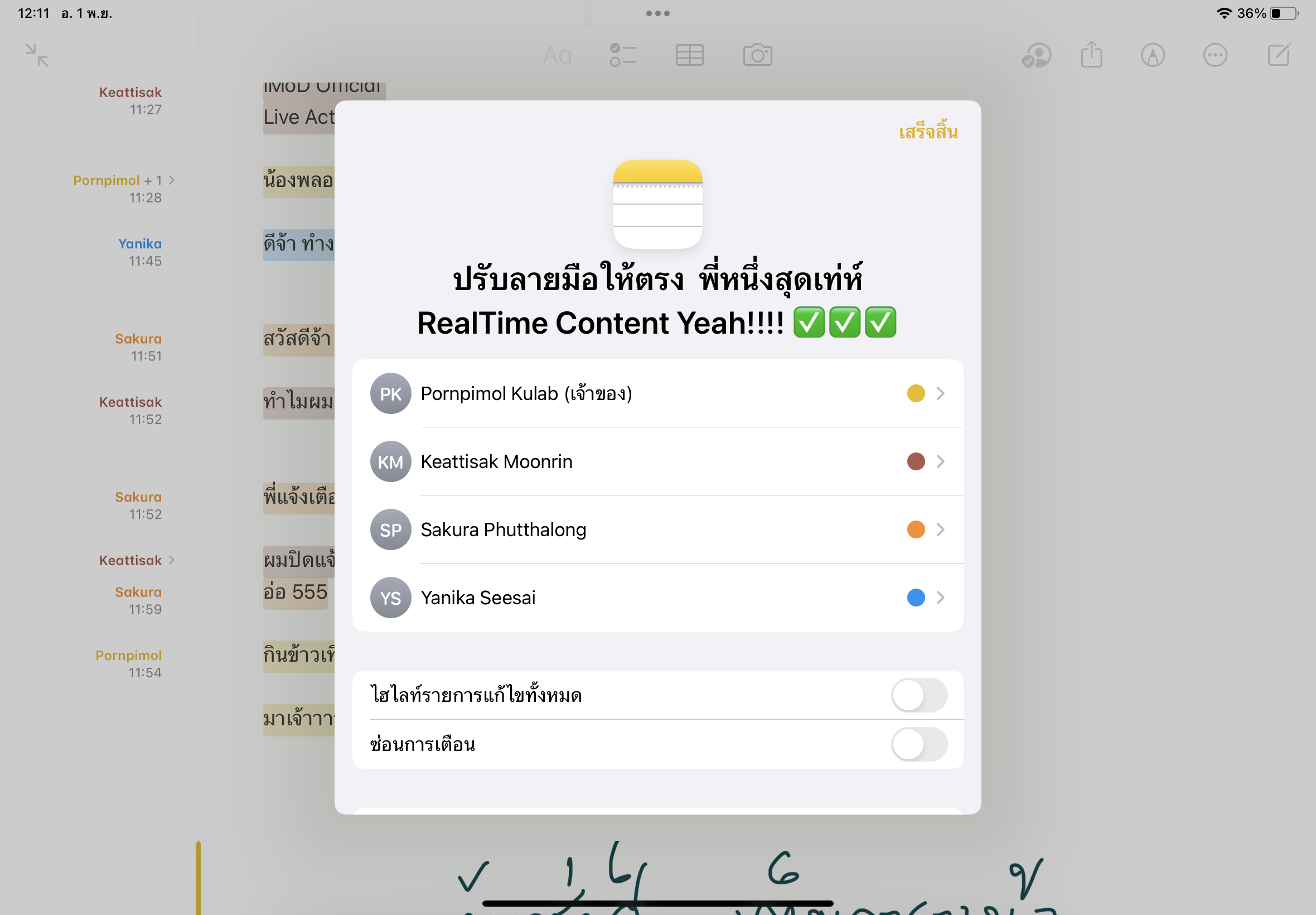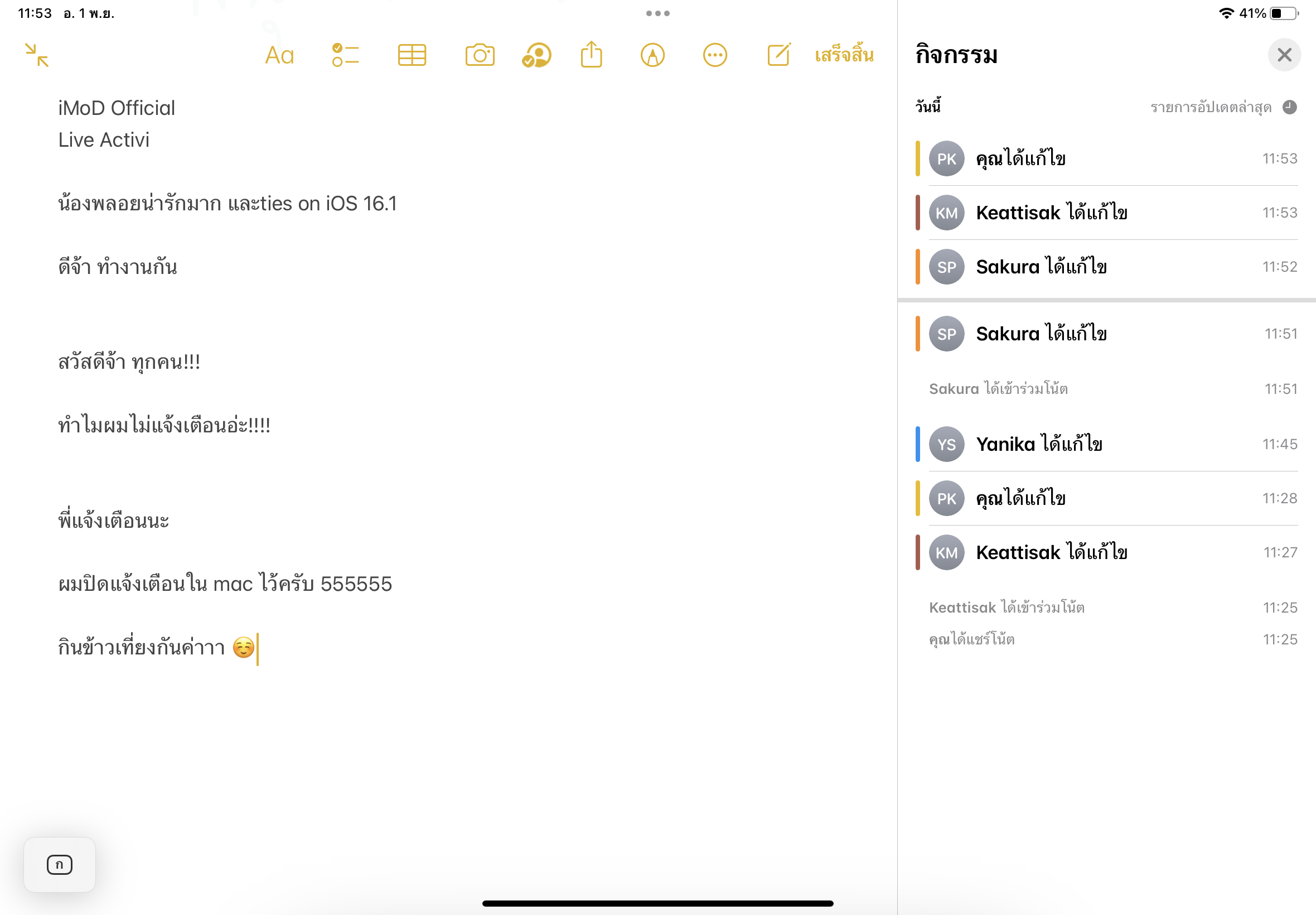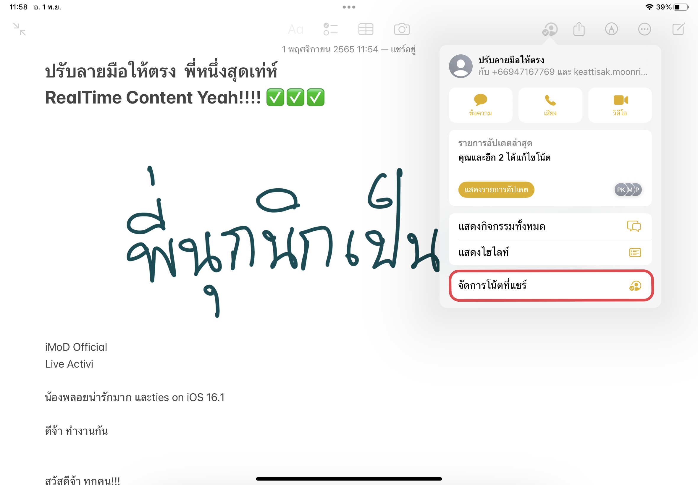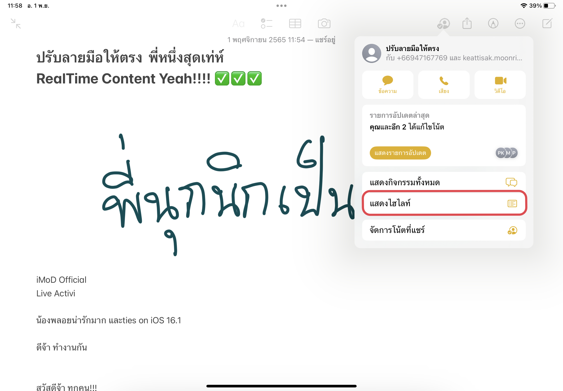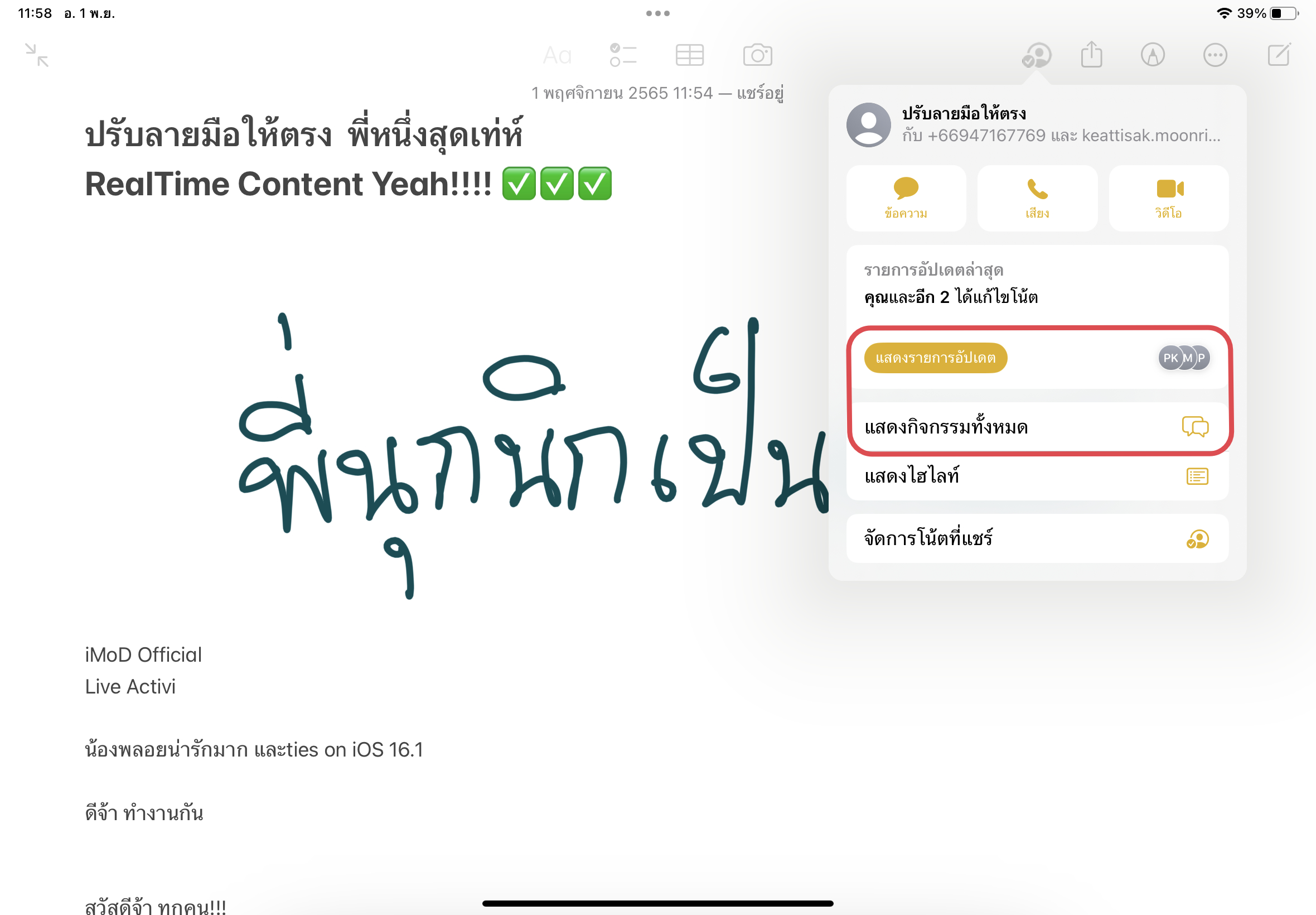 หากแตะที่ไอคอนรูปคนที่แชร์จะมีเมนูต่าง ๆ แสดงขึ้นมา เมนู “แสดงกิจกรรมทั้งหมด” หรือ “แสดงรายการอัปเดต” ก็จะมีแถบแสดงรายการแก้ไขงานของคนอื่น ๆ ขึ้นมาด้านขวามือ