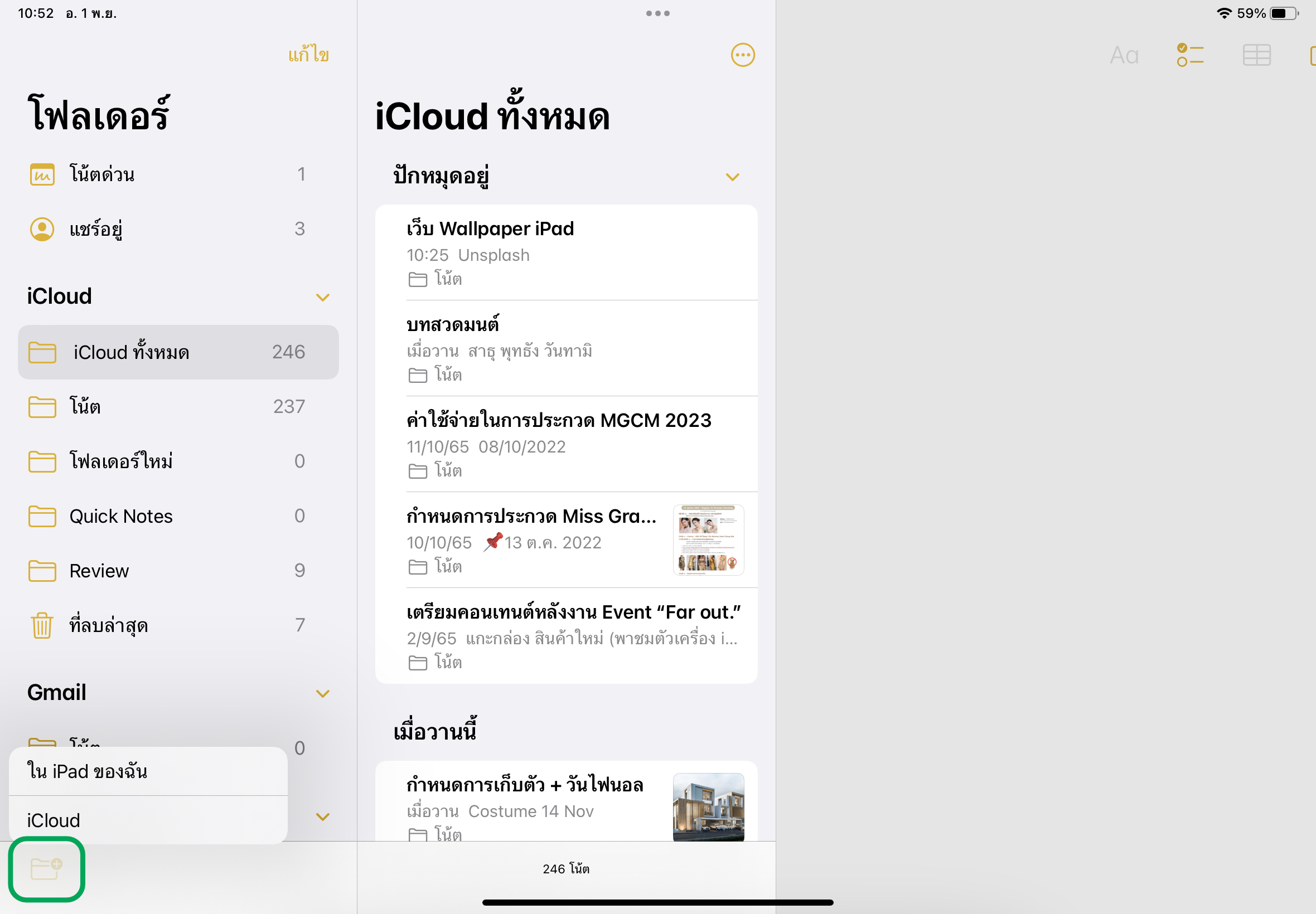 2. แตะ โฟลเดอร์รูปบวกมุมซ้ายล่าง หลังจากนั้นจะมีเมนูให้เลือกว่าเราต้องการสร้างโฟลเดอร์จาก “ใน iPad ของฉัน” หรือจาก “iCloud”