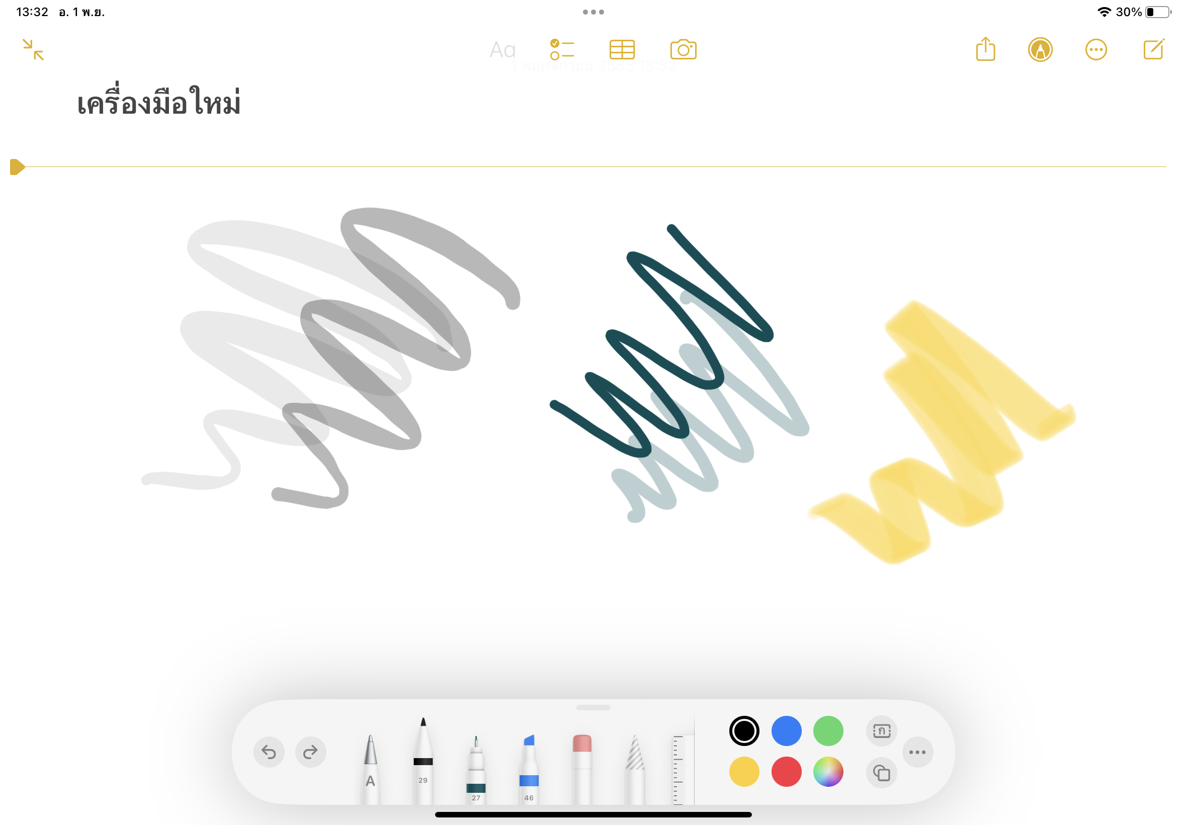 แอปโน้ตใน iPadOS 16.1 มีการเพิ่มเครื่องมือใหม่เข้ามา ได้แก่ พู่กันสีน้ำ, หมึกซึม, ปากกาไฮไลท์