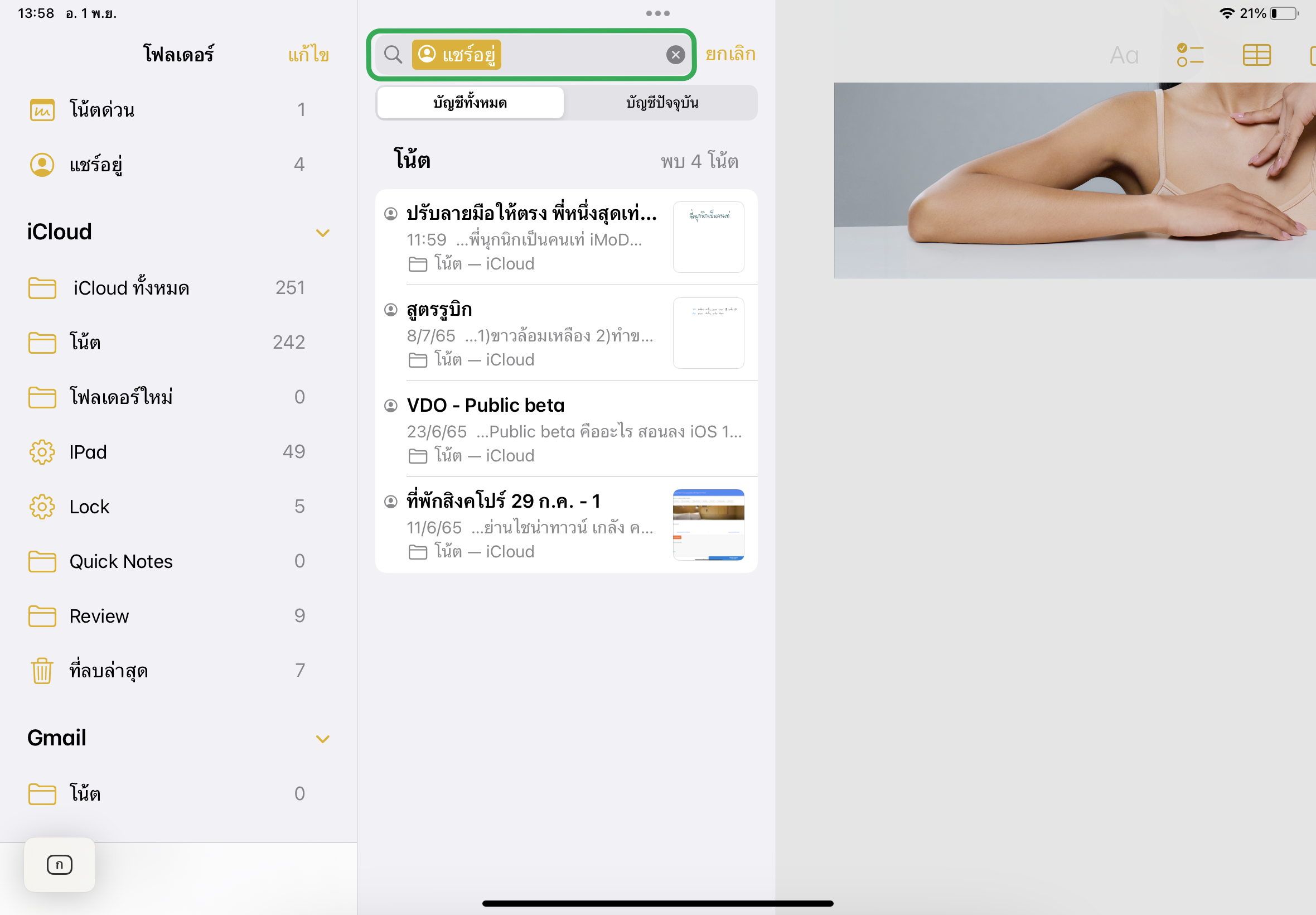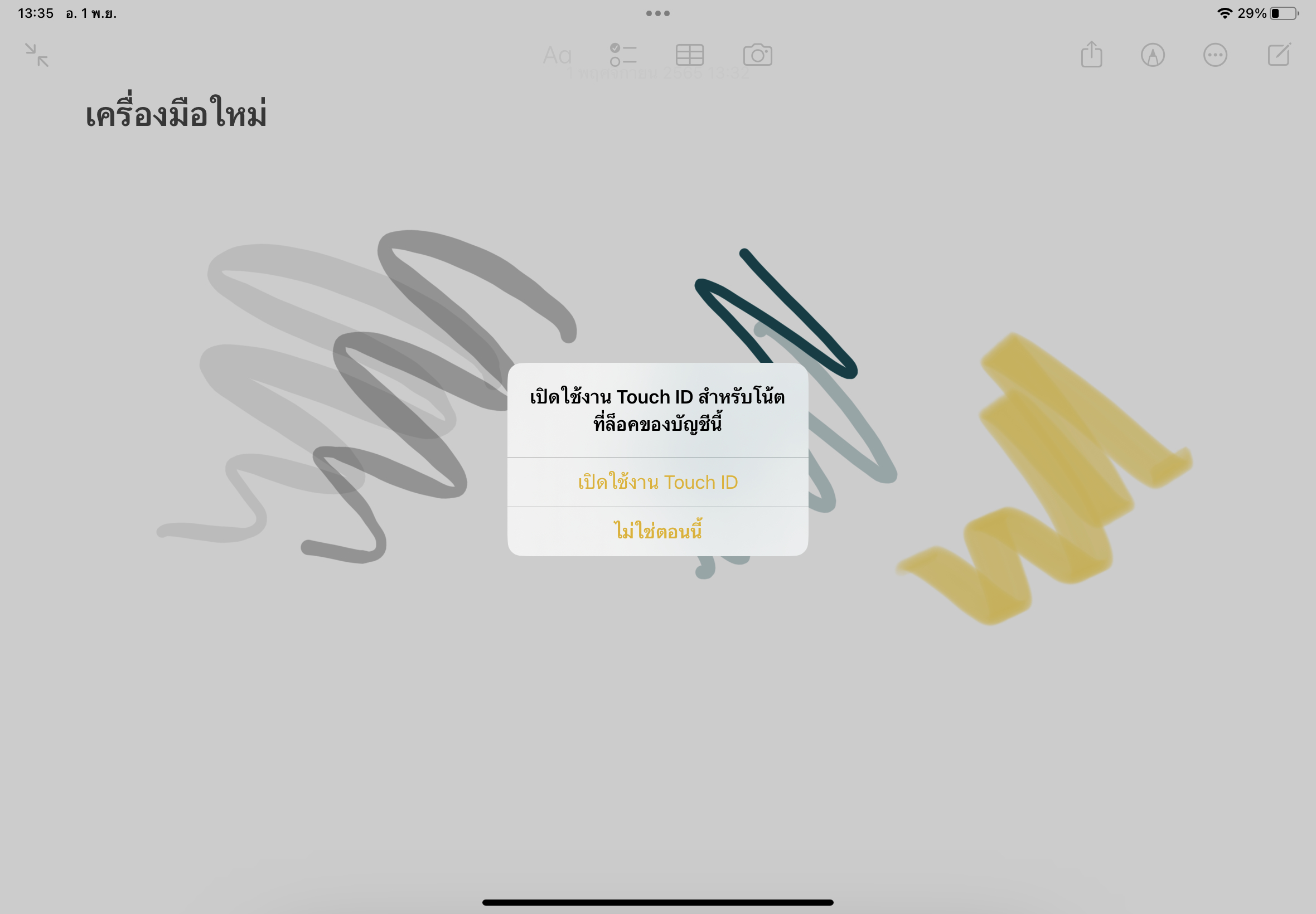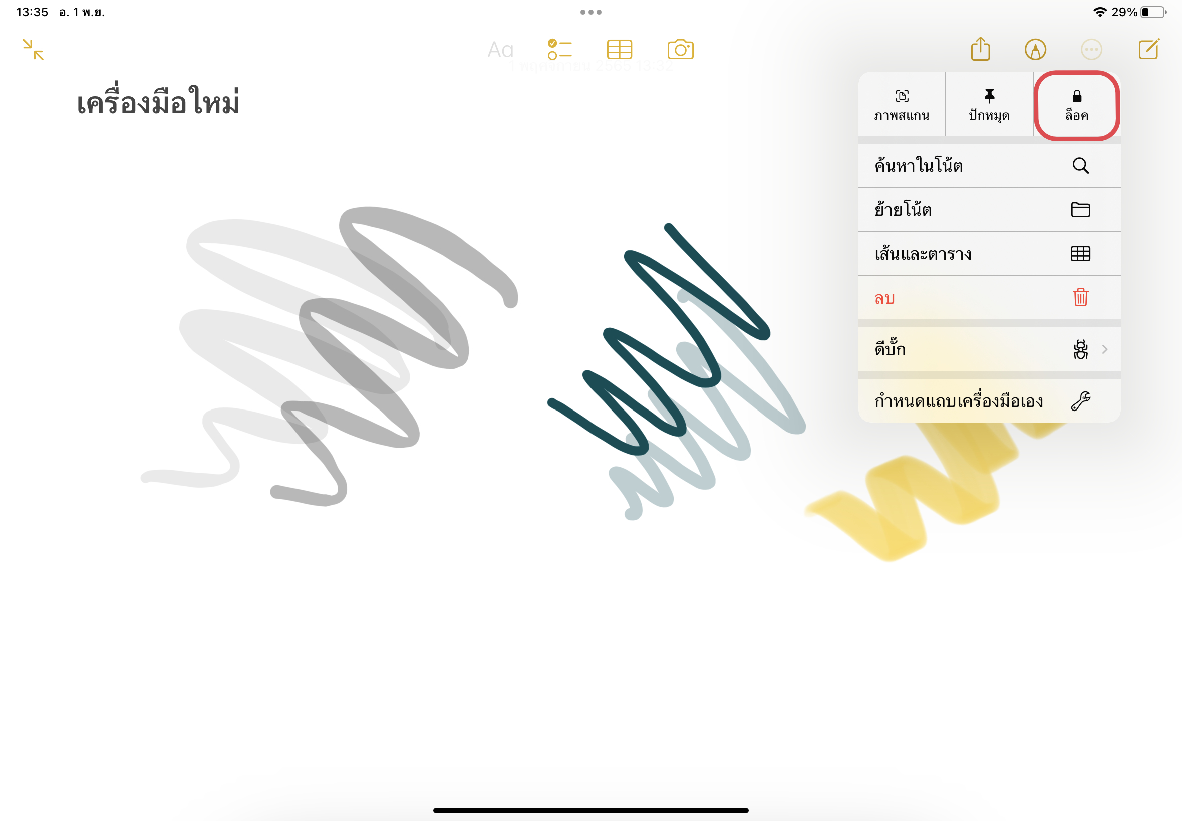 วิธีการคือ แตะที่จุดสามจุด > เลือกไอคอน “ล็อค” > ใส่รหัสผ่าน iPad หรือ เลือกเปิดใช้งานล็อคโน้ตด้วย Touch ID ได้