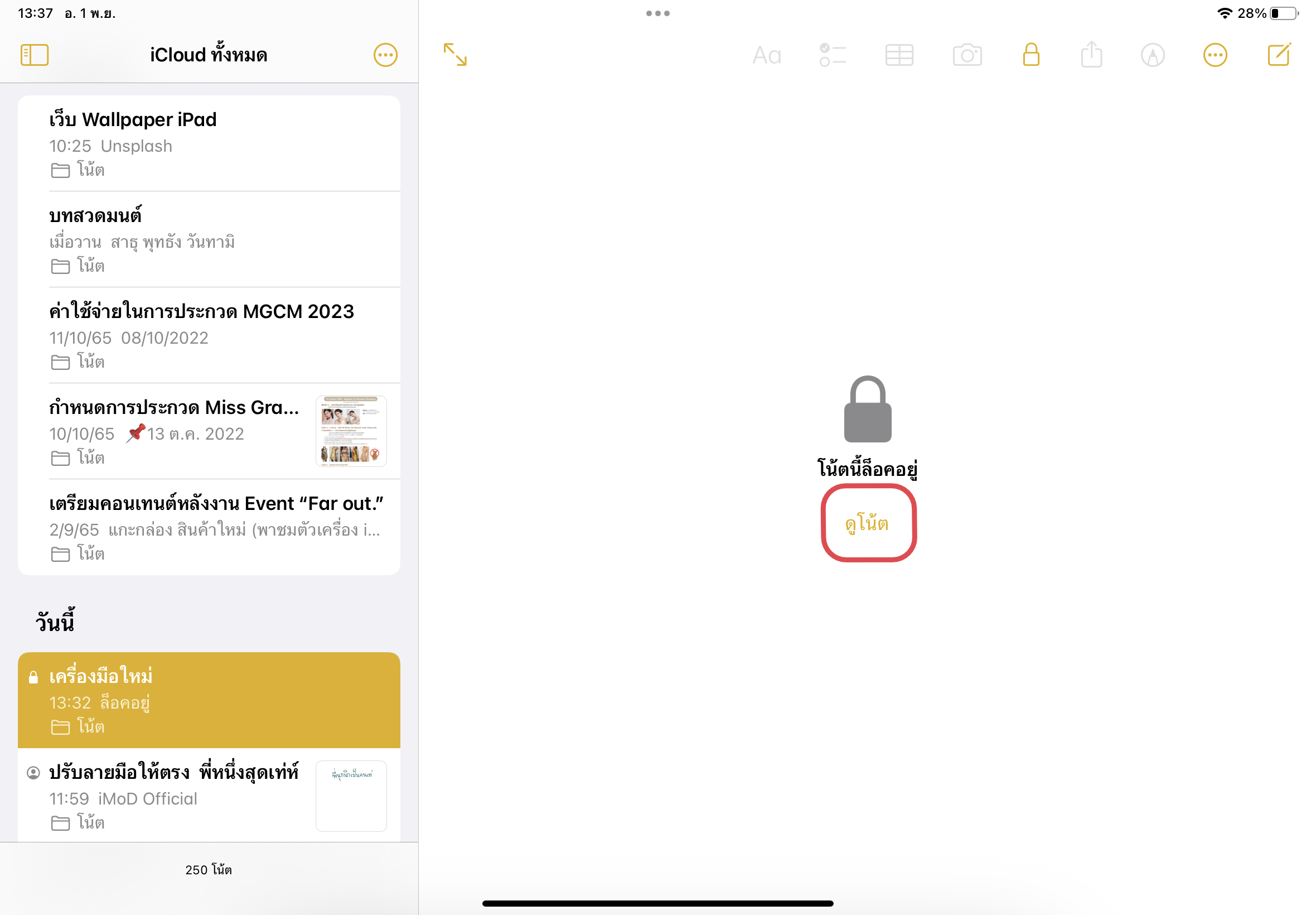 หากต้องการเข้ามาดูโน้ตที่ล็อคไว้ ให้แตะที่ “ดูโน้ต” > ยืนยันตัวตน แล้วเข้าดูโน้ตที่ล็อคไว้ได้เลย