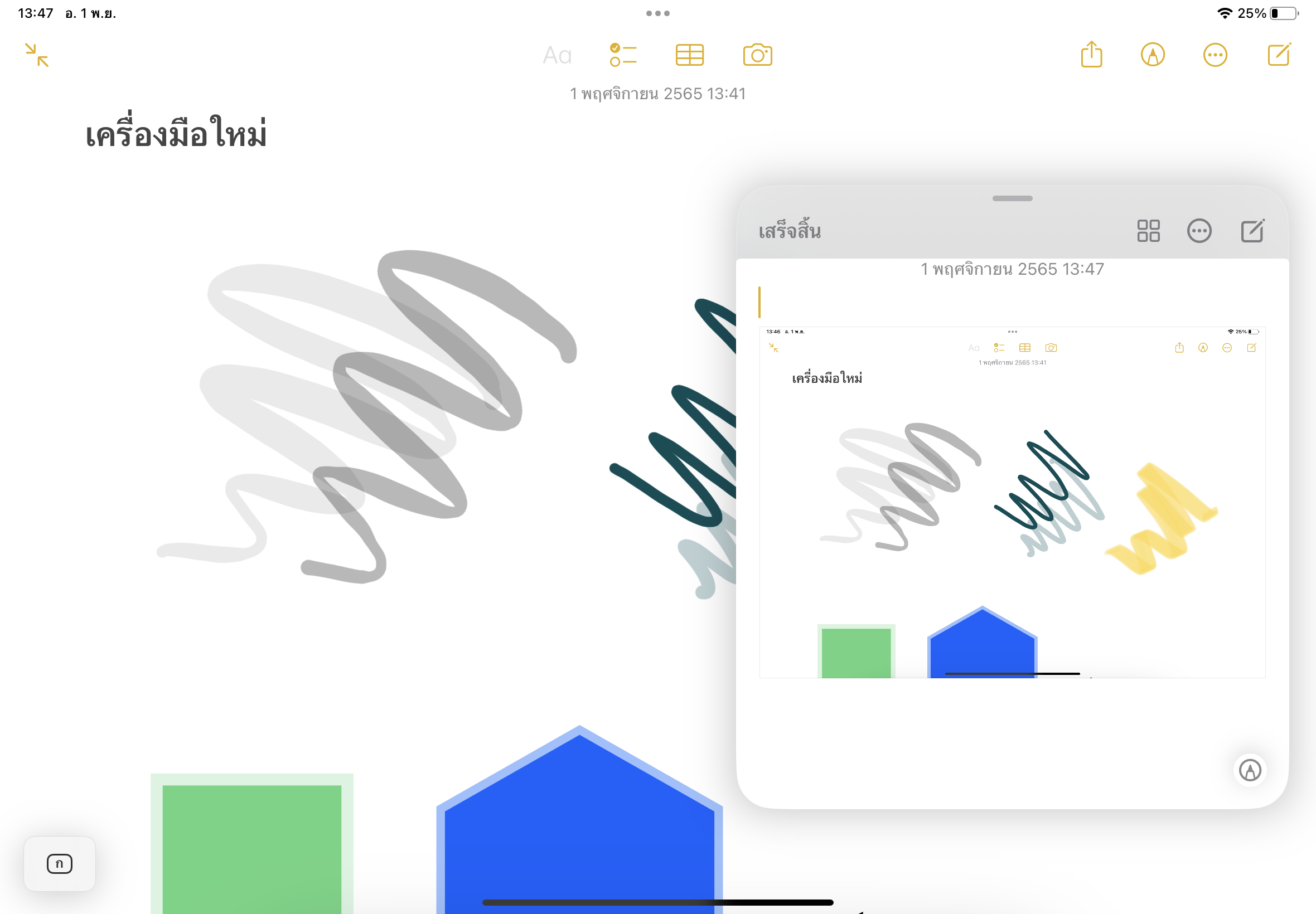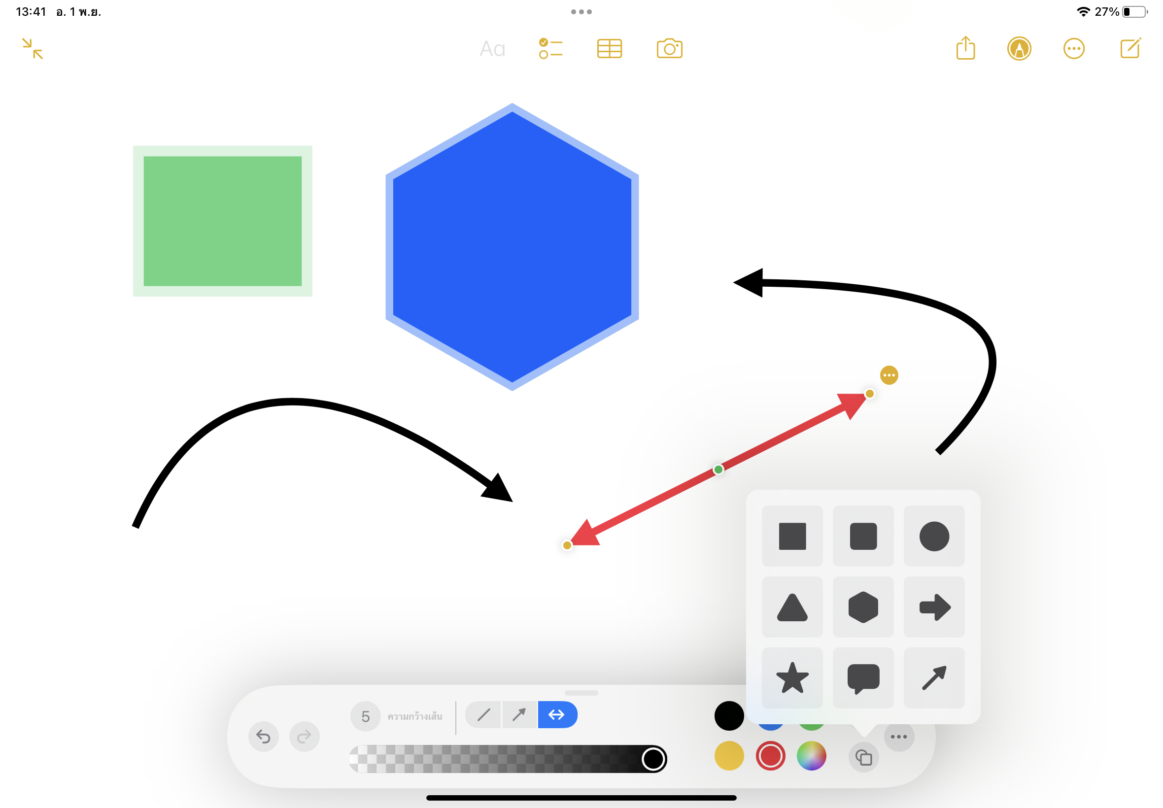 แอปโน้ตใน iPadOS 16.1 เพิ่มรูปทรงและลูกศรเข้ามาด้วย สามารถเลือกปรับเปลี่ยนสีรูปทรง เส้นขอบ หรือปรับรูปทรงของลูกศรได้ตามต้องการ เจ๋งสุด ๆ ซึ่งรูปทรงและลูกศรที่เพิ่มเข้ามาใหม่นี้สามารถใช้นิ้วมือในการวาด หรือใช้ Apple Pencil ได้เลย