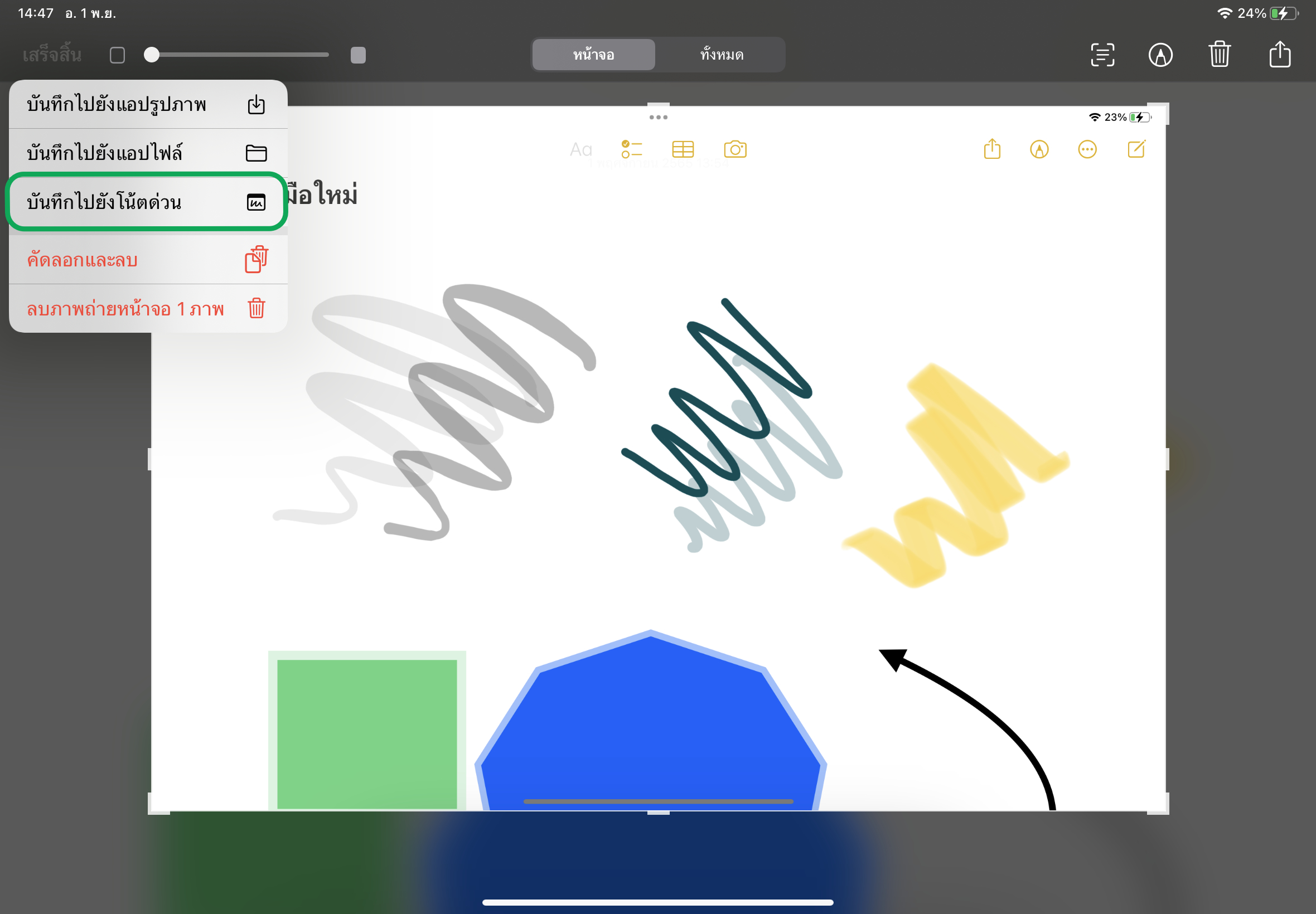 ถ้าหากว่าเราแคปจอภาพแล้ว สามารถเพิ่มภาพแคปหน้าจอไปที่โน้ตด่วนได้เลย วิธีการคือ แคปจอภาพ > แตะภาพที่แคปมุมซ้ายล่าง > แตะ “เสร็จสิ้น” > เลือก “บันทึกไปยังโน้ตด่วน”