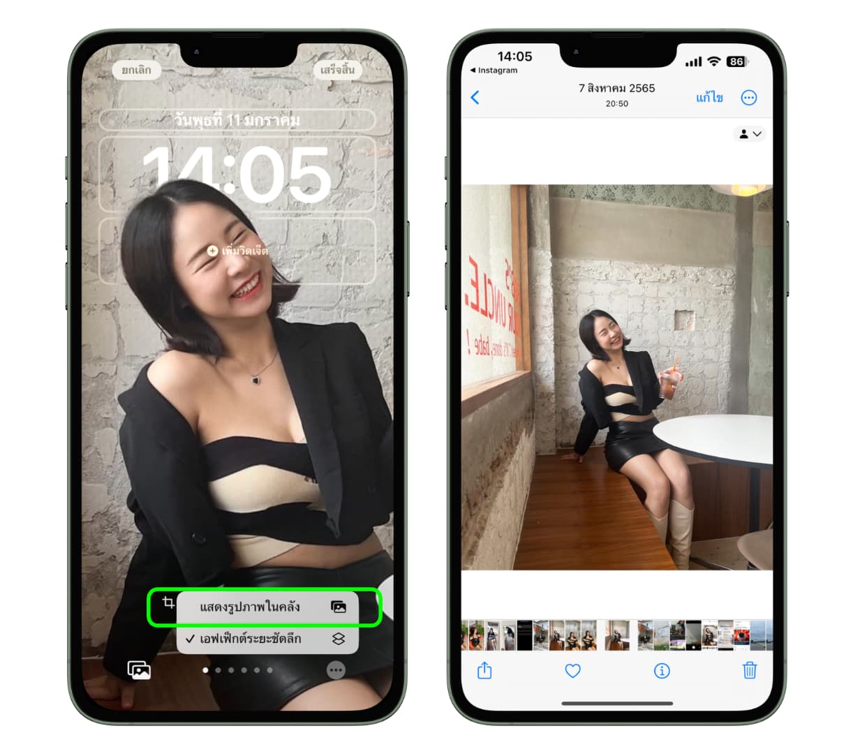 หากเราปรับแต่งหน้าจอล็อคที่มีภาพพื้นหลังเป็นรูปถ่ายหรือรูปภาพบุคคลที่จัดเก็บอยู่ในเครื่อง ใน iOS 16.2 จะมีตัวเลือกเพื่อให้เราเข้าไปดูรูปภาพจากอัลบั้มรูปภาพใน iPhone ได้ ทำให้เราเลือกเปลี่ยนภาพพื้นหลังโดยใช้รูปจากในเครื่องได้ง่ายขึ้น