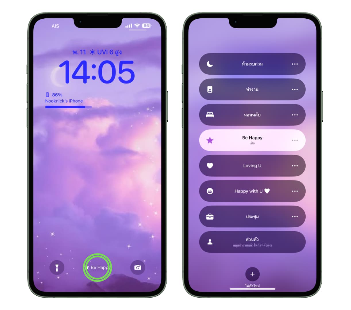 เปลี่ยนโหมดโฟกัสจากหน้าจอล็อคง่าย ๆ แตะค้างที่ชื่อโหมดโฟกัสบริเวณด้านล่างของจอ จากนั้นก็เลือกเปลี่ยนหรือสลับโหมดโฟกัสจากกน้าจอล็อคได้เลย