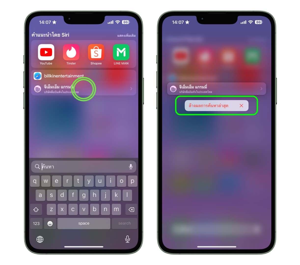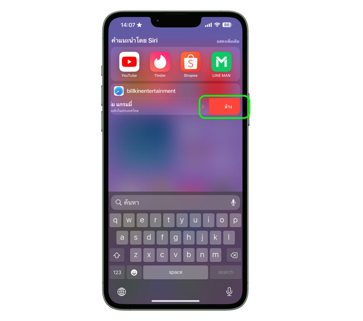 แตะค้างที่ประวัติการค้นหาในหน้า Spotlight Serach เพื่อล้างประวัติการค้นหาล่าสุด หรือจะเลือกลบทีละอันโดยการปัดการค้นหาไปทางซ้ายแล้วแตะ “ล้าง”