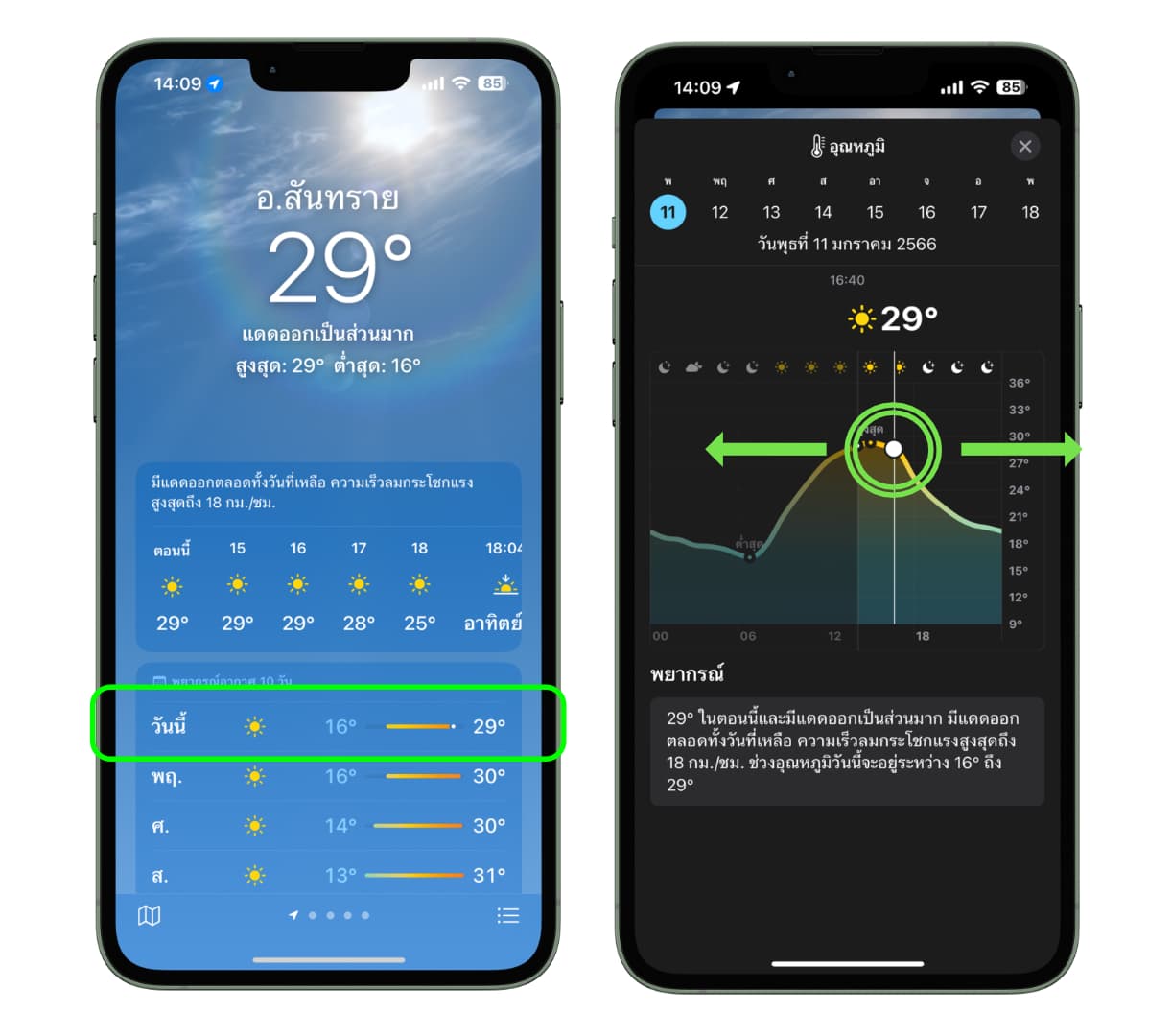ในแอปสภาพอากาศ เราสามารถดูสภาพอากาศแบบรายนาทีได้แล้ว จากเดิมดูได้แบบรายชั่วโมง แตะที่กราฟรายงานสภาพอากาศจากนั้นลากนิ้วไปทางซ้ายหรือขวาเราก็จะดูสภาพอากาศเป็นรายนาทีที่มีความแม่นยำได้