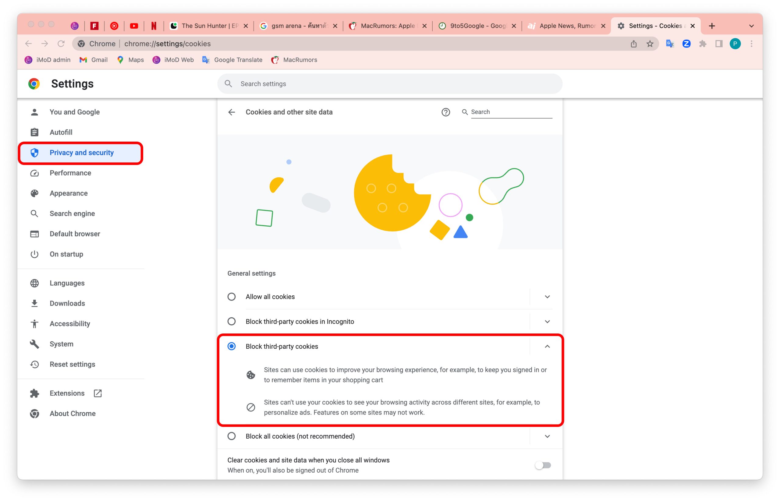 วิธีการคือ ไปที่ “จุดสามจุด” มุมบนขวา > เลือก Settings > ไปที่ Privacy and security > เลือก Cookies and other site data > กดเลือก “Block third-party cookies”