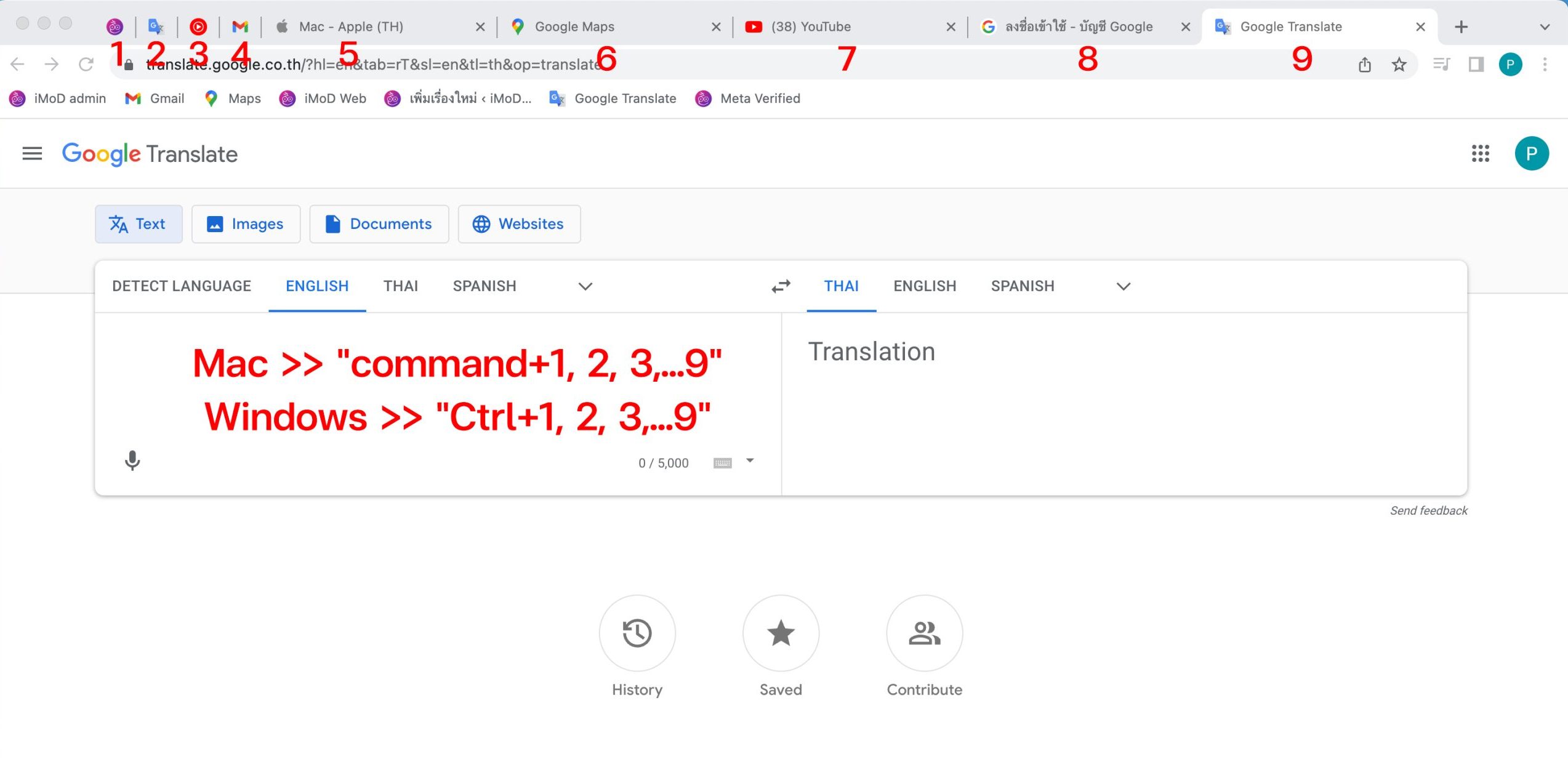 - การใช้งานบน Mac ใช้คำสั่ง “⌘+1, 2, 3,…9”