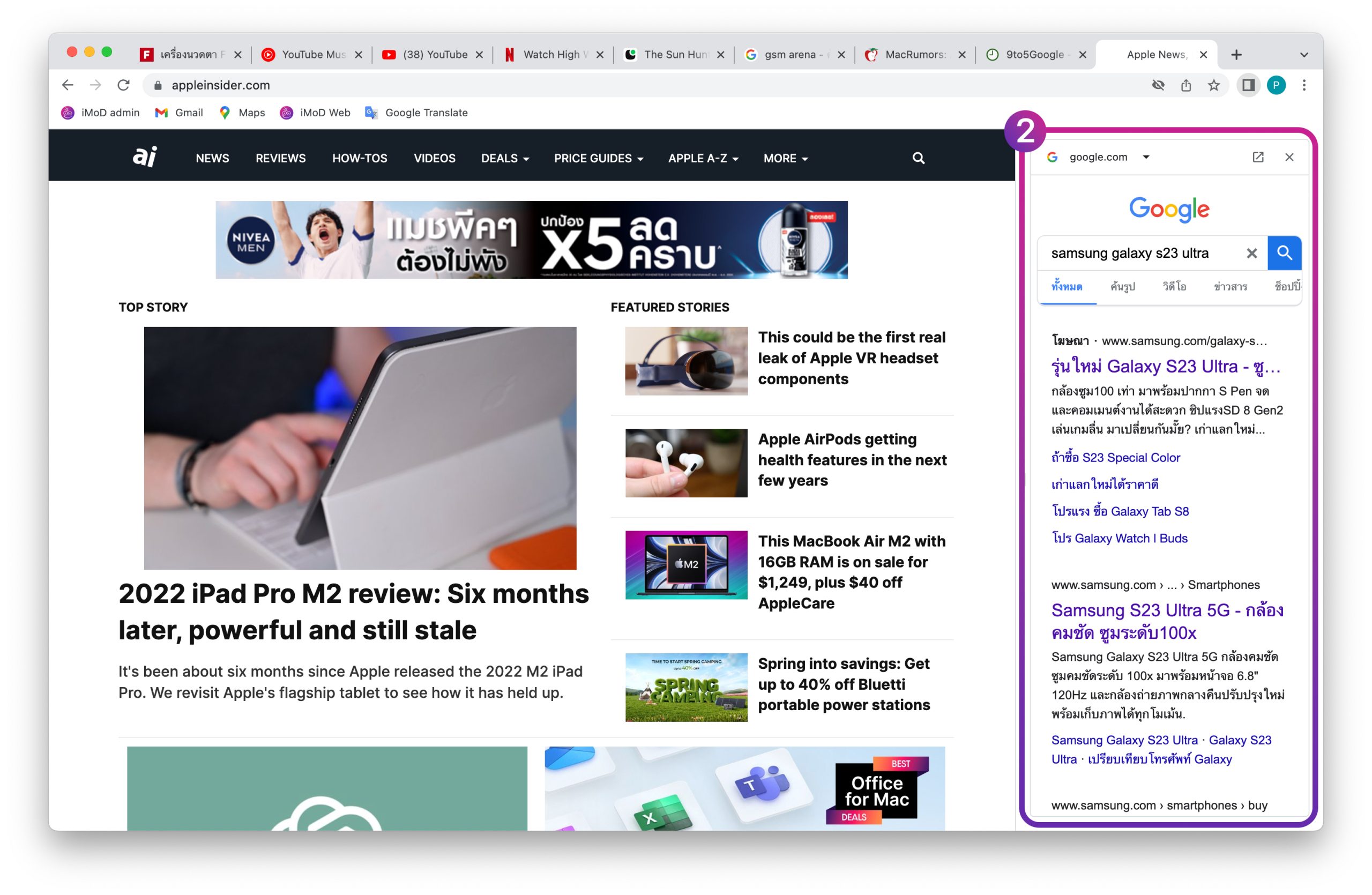 วิธีการคือ เข้าไปหน้าเว็บไซต์ที่ต้องการค้นหาข้อมูล > คลิกที่สัญลักษณ์ “Google” ในแถบ URL ด้านบนขวา > ใช้งานค้นหาแบบสองหน้าต่างได้เลย