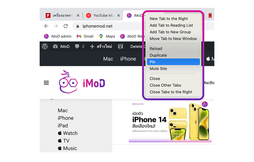 วิธีการคือ คลิกขวาบนแท็บที่ต้องการปักหมุด > เลือก “Pin” > แท็บจะถูกปักหมุดอยู่ซ้ายมือ