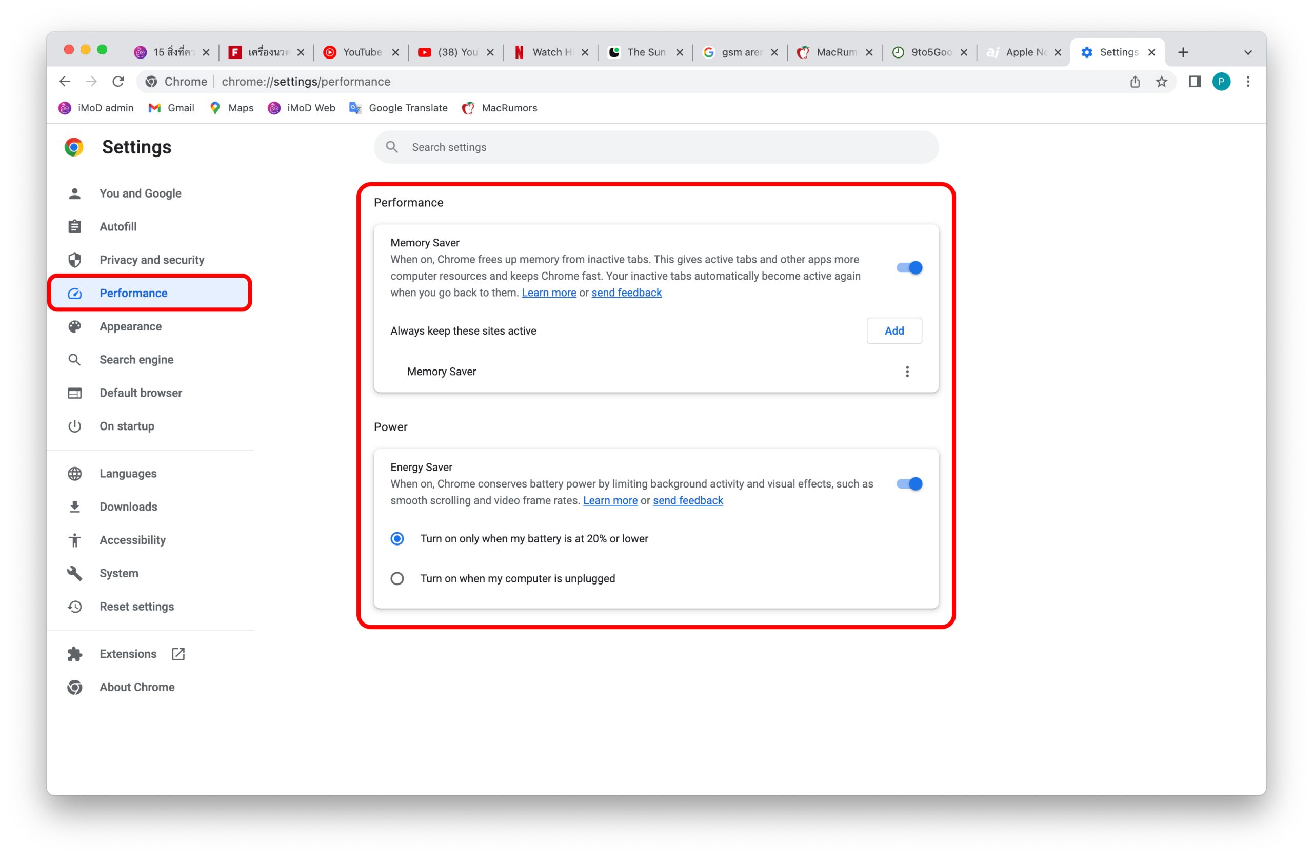 Energy Saver เวลาที่เครื่องมีแบตเหลือต่ำกว่า 20% และไม่ได้เสียบสายชาร์จอยู่ ตัว Google Chrome จะปิดการทำงานเบื้องหลังของเว็บไซต์ต่าง ๆ ให้ เช่น การเล่นเพลง, วิดีโอ, หรือเอฟเฟกต่าง ๆ เพื่อช่วยยืดเวลาการใช้งานให้ยาวนานขึ้น