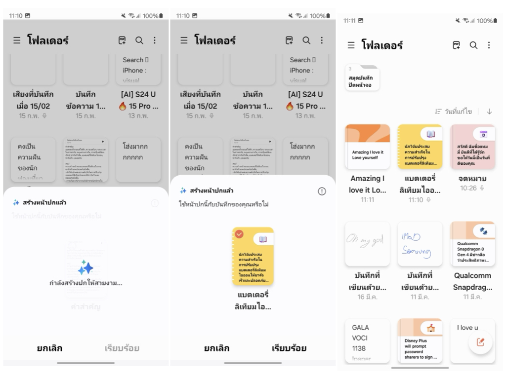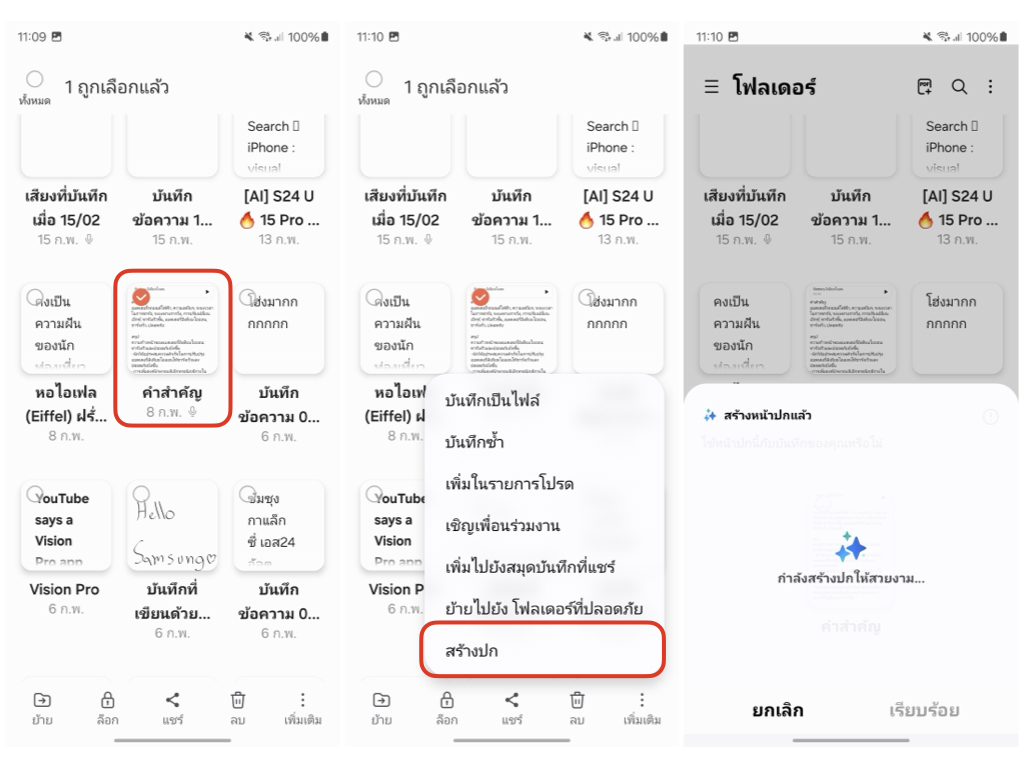 ตกแต่งหน้าปกโน้ตให้ดูสวยงาม ช่วยให้แบ่งหมวดหมู่ของเนื้อหาได้ง่ายขึ้น แถมยังสร้างความสนุกให้กับการจดโน้ตเพิ่มขึ้นด้วย วิธีการคือ แตะค้างโน้ตที่ต้องการ > แตะจุดสามจุด > สร้างปก > รอ AI ประมวลผลหน้าปกให้เข้ากับเนื้อที่บันทึก > เรียบร้อย