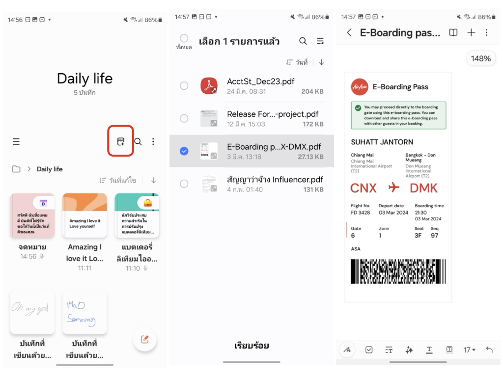 เพิ่มไฟล์ PDF จากแหล่งเก็บข้อมูลส่วนอื่นได้ เช่น ที่จัดเก็บข้อมูลภายใน, OneDrive, Google Drive เป็นต้น ซึ่งบน Samsung Note เพิ่มไฟล์เหล่านี้ง่ายมาก เพียงแค่แตะที่ไอคอนเพิ่มไฟล์ PDF > เลือกไฟล์ > วิธีนี้สะดวกเวลาต้องการอ่านไฟล์ PDF หรือเซ็นเอกสารต่างๆ ก็สามารถเปิดผ่านแอปโน้ตได้เลย