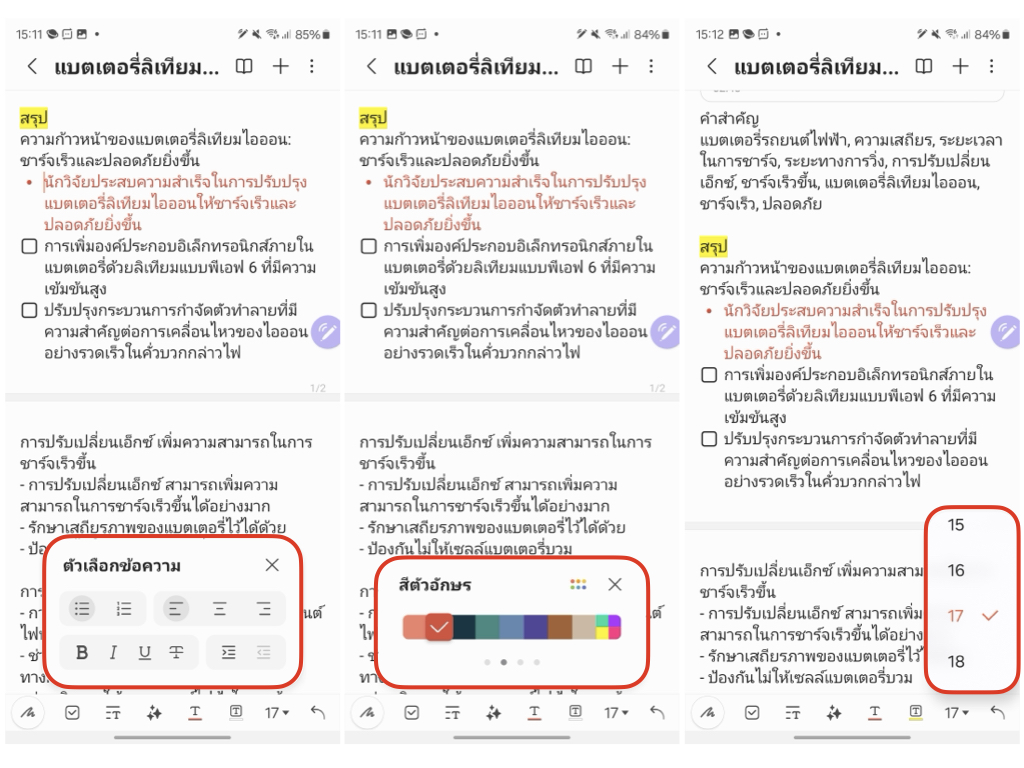 แอปโน้ตในซัมซุงอัปเดตใหม่อยู่เสมอ มีเครื่องมือการจัดรูปแบบ จัดระเบียบข้อความค่อนข้างครอบคลุม ไม่ว่าจะเป็นตัวช่วยเช็คลิสต์, ตัวเลือกจัดข้อความ, เปลี่ยนสีตัวอักษร, เพิ่มสีพื้นหลังตัวอักษร, ปรับขนาดข้อความและอื่นๆ ใช้งานง่าย คล้ายกับโปรแกรมเอกสารของ Microsoft จนแทบไม่ต้องปรับตัวในการใช้งานเลย โดยแถบเครื่องมือทั้งหมดจะปรากฎอยู่ด้านล่างของโน้ต
