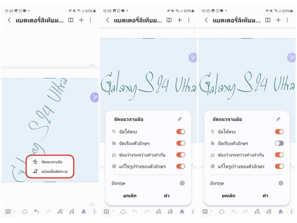 ใครชอบจด Quick Note บนซัมซุงแล้วเจอปัญหาเขียนตัวอักษรไม่ตรง เขียนเอียง เขียนแนวนอนบนจอแล้วกลับมาอ่านยาก ปัญหาต่างๆ เหล่านี้ถูกจัดการด้วยฟีเจอร์สำหรับ S Pen เพียงแค่แตะไอคอน Magic ด้านล่าง > จัดแนวลายมือ > เลื่อนเปิดเครื่องมือจัดแนวลายมือตามภาพ เพียงเท่านี้ก็ไม่ต้องกลัวว่าจะกลับมาอ่านลายมือตัวเองไม่รู้เรื่องภายหลังแล้วค่ะ