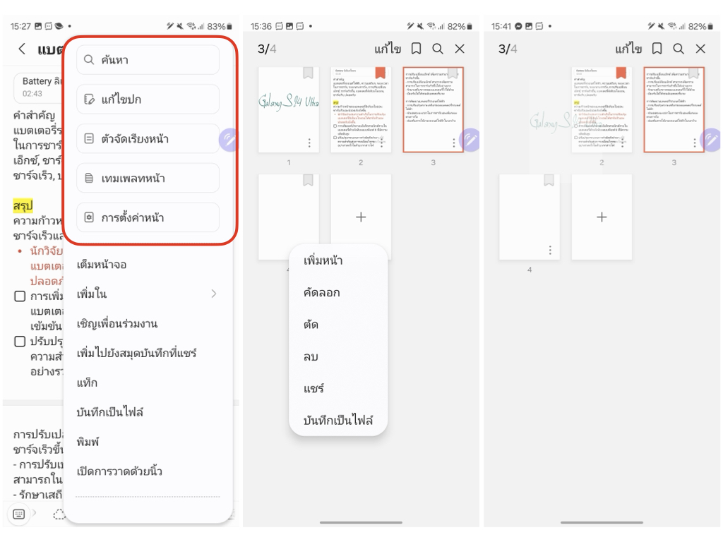 แอปโน้ตบนซัมซุงมีลูกเล่นการจัดการหน้ากระดาษเยอะมากตอบโจทย์คนที่ชอบตกแต่ง หรือจัดระเบียบโน้ตของตัวเองมากเมื่อแตะที่จุดสามจุดมุมบนขวาจะเห็นเมนูต่างๆ ได้แก่