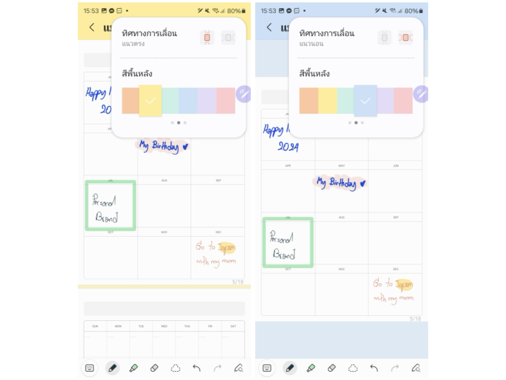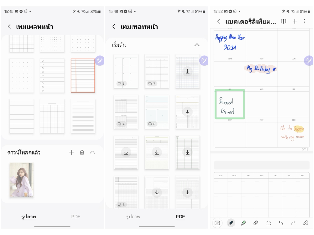 - เทมเพลตหน้า: แอปโน้ตมีเทมเพลตการจดโน้ตในประเภทต่างๆ มาให้ค่อนข้างครบ ไม่ว่าจะเป็นแบบจุด เส้น ตาราง ปฏิทิน รวมถึงเทมเพลตแบบไฟล์ PDF ที่ออกแบบมาให้สำหรับคนที่ชอบทำ Planner ก็สามารถใช้เทมเพลตจากแอปโน้ตได้เลย ไม่ต้องไปโหลดเพิ่ม สะดวกมาก นอกจากนี้ยังสามารถเพิ่มพื้นหลังของแอปโน้ตได้เองอีกด้วย