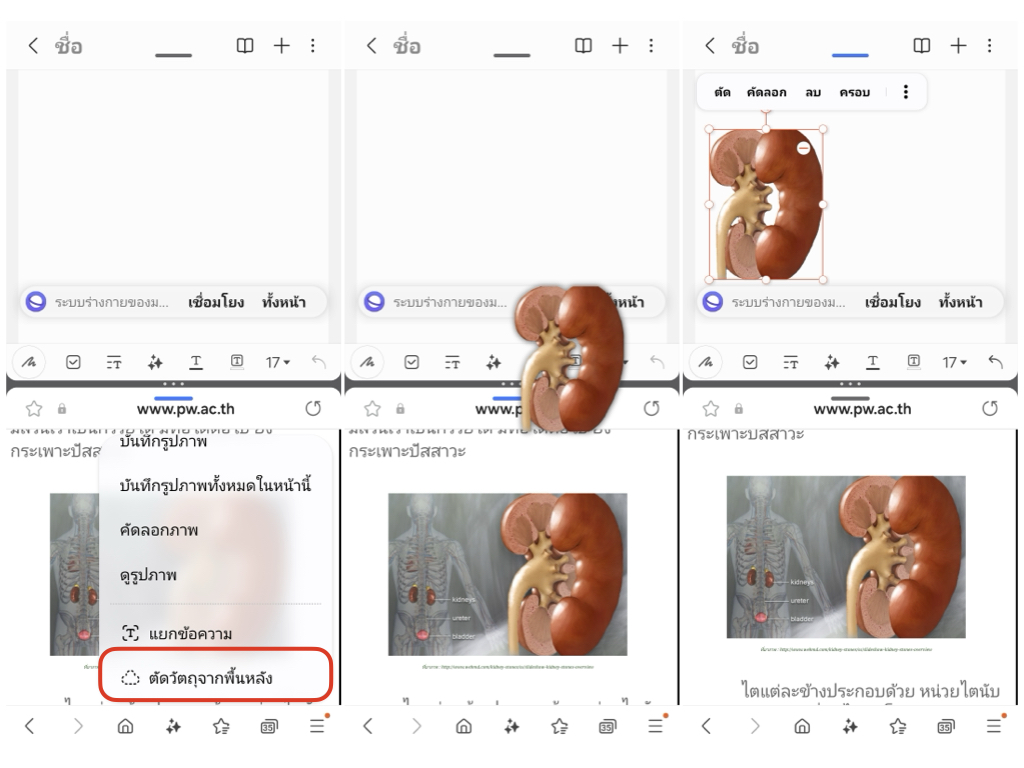 ใครที่ชอบจดเลคเชอร์ไปด้วยพร้อมกับเปิดแอปอื่นดูไปด้วยสามารถใช้ฟีเจอร์ลากวางไฟล์จากแอปอื่นมาลงในโน้ตได้เลย เช่น เปิดหน้าจอแอปโน้ตกับ Samsung Internet พร้อมกันก็สามารถลากรูปภาพแล้วเอามาวางบนแอปโน้ตได้เลย แตะค้างที่รูป > ตัดวัตถุจากพื้นหลัง > ลากไฟล์ลงไปบนแอปโน้ตได้เลย