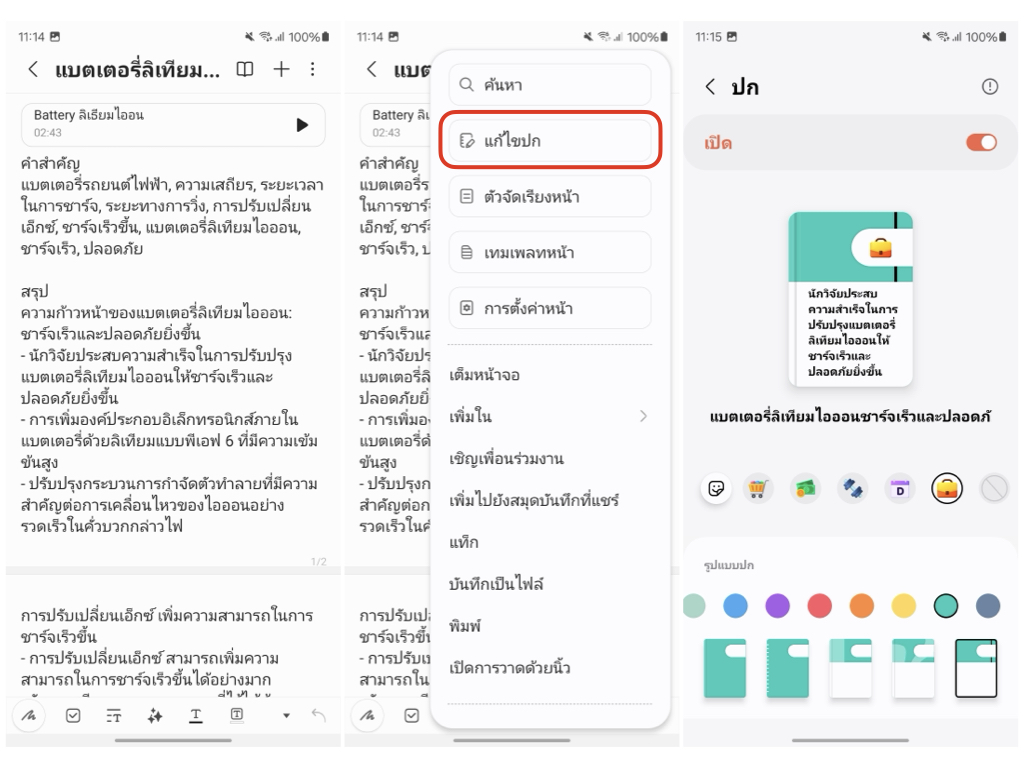 หากไม่ชอบหน้าปกที่ AI Generate มาให้สามารถเข้าไปแก้ไขได้ > เลือกโน้ต > แก้ไขปก > จากนั้นเลือกรูปแบบ สี หรือ ไอคอน ได้ตามต้องการเลย