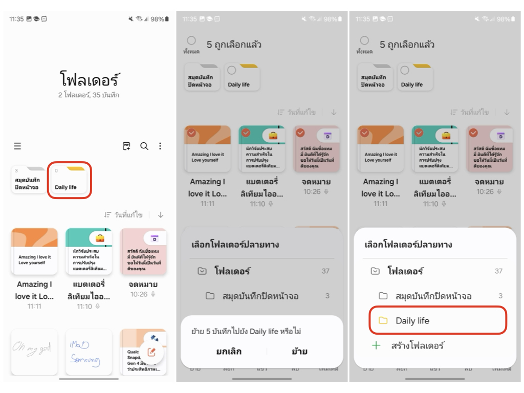 เลือกโน้ตที่ต้องการย้ายไปใส่โฟลเดอร์ > ย้าย > เลือกโฟลเดอร์ เพียงเท่านี้ก็สามารถจัดหมวดหมู่โน้ตได้แล้ว สามารถแตะเข้าไปที่โฟลเดอร์ แล้วสร้างโน้ตใหม่ในโฟลเดอร์ได้เลย