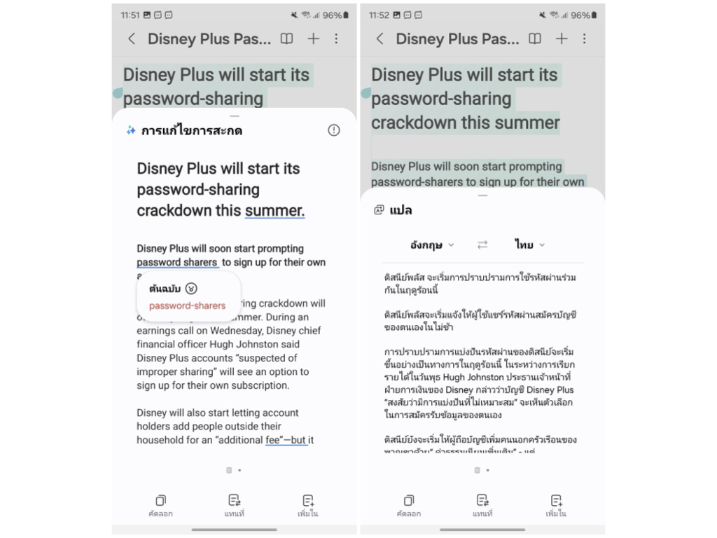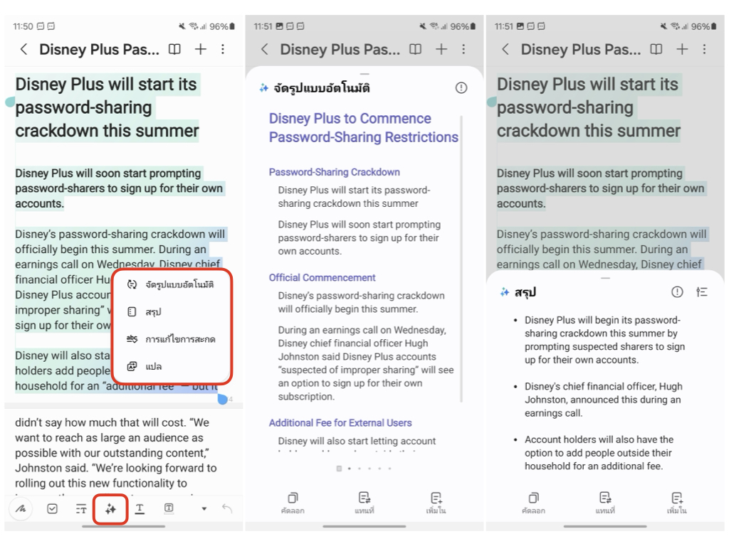 ฟีเจอร์ AI ใหม่ติดเครื่องที่เพิ่มเข้ามาใน Galaxy S24 Ultra เพียงแค่แตะที่ไอคอน AI ด้านล่าง ก็จะมีตัวเลือกปรากฎขึ้นมา ได้แก่ การจัดรูปแบบอัตโนมัติ, สรุป, การแก้ไขการสะกด, แปลภาษา เรียกได้ว่าฟีเจอร์นี้ช่วยให้สาวกซัมซุงทำงานง่าย และสะดวกขึ้นเยอะเลย