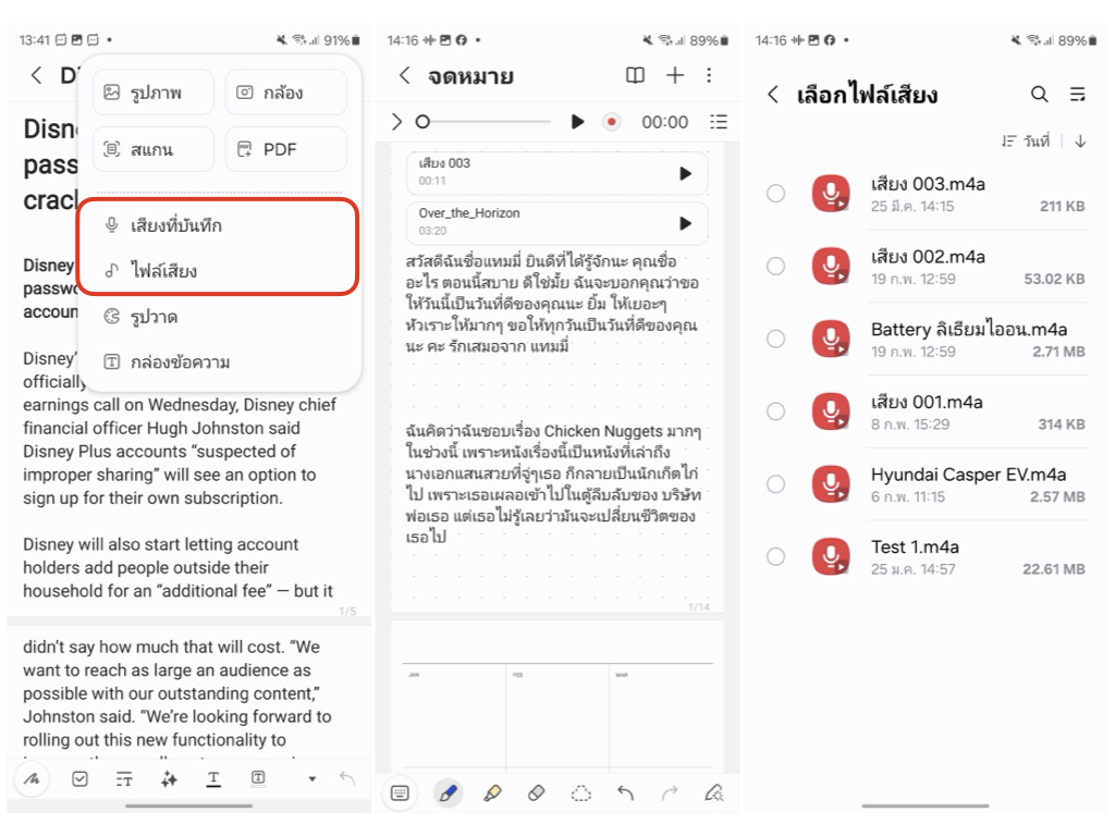 แอปโน้ตติดเครื่องของซัมซุงสามารถอัดเสียงระหว่างที่จดโน้ตได้ ช่วยให้ไม่พลาดหรือตกหล่นประเด็นสำคัญแม้แต่นิดเดียว นอกจากนี้ก็ยังสามารถเพิ่มไฟล์เสียงที่อัดมาจากแอปบันทึกเสียงได้ด้วย โดยแตะที่ไอคอนบวก > เลือกอัดเสียง “เสียงที่บันทึก” หรือเพิ่ม “ไฟล์เสียง”