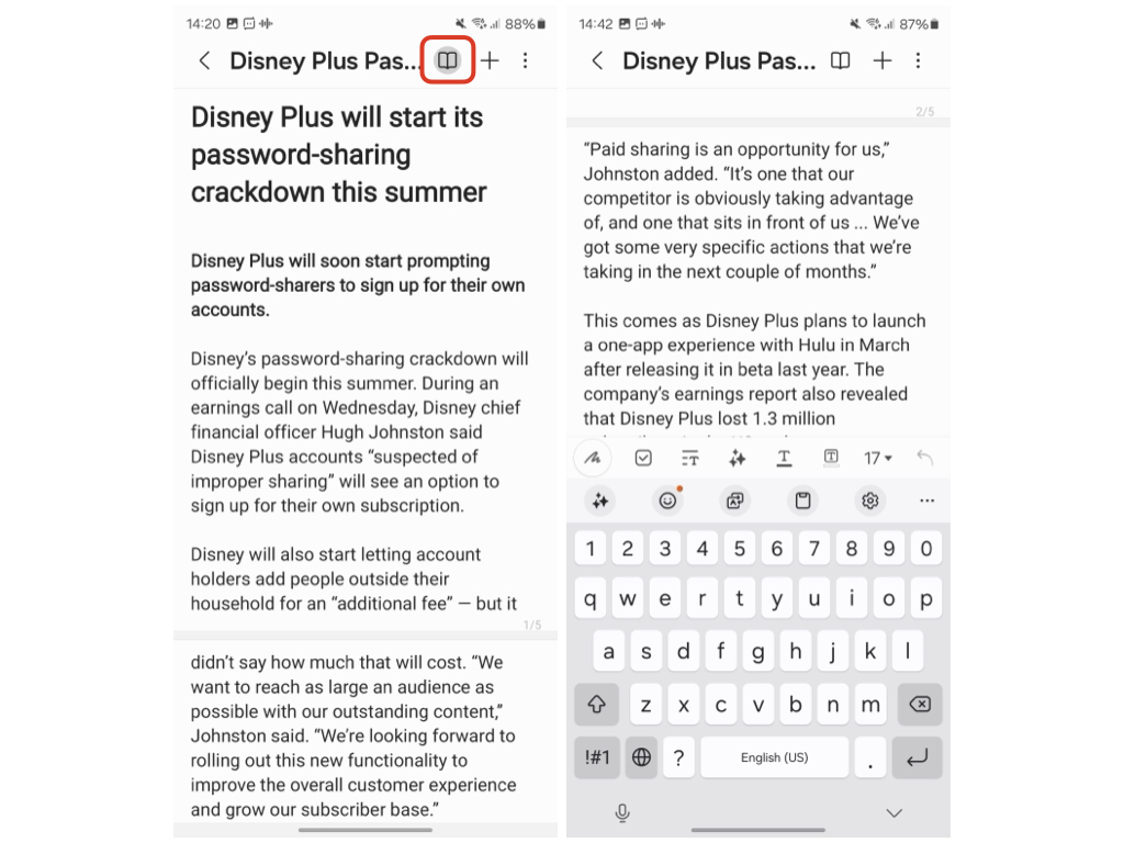 โหมดนี้มีไว้สำหรับคนที่ชอบอ่านหนังสือ, E-Book, บทความบนแอปโน้ต โดยไม่ได้ใช้แป้นพิมพ์หรือ S Pen ในการจด ก็สามารถเปิดโหมดนี้ไว้เพื่อเลื่อนอ่านหนังสือเพียอย่างเดียวได้ ป้องกันนิ้วแตะหน้าจอแล้วแป้นพิมพ์เด้งขึ้นมาตอนเลื่อนอ่านข้อความ เปิดใช้โหมดนี้ง่ายๆ ด้วยการแตะไอคอนหนังสือมุมบนขวา