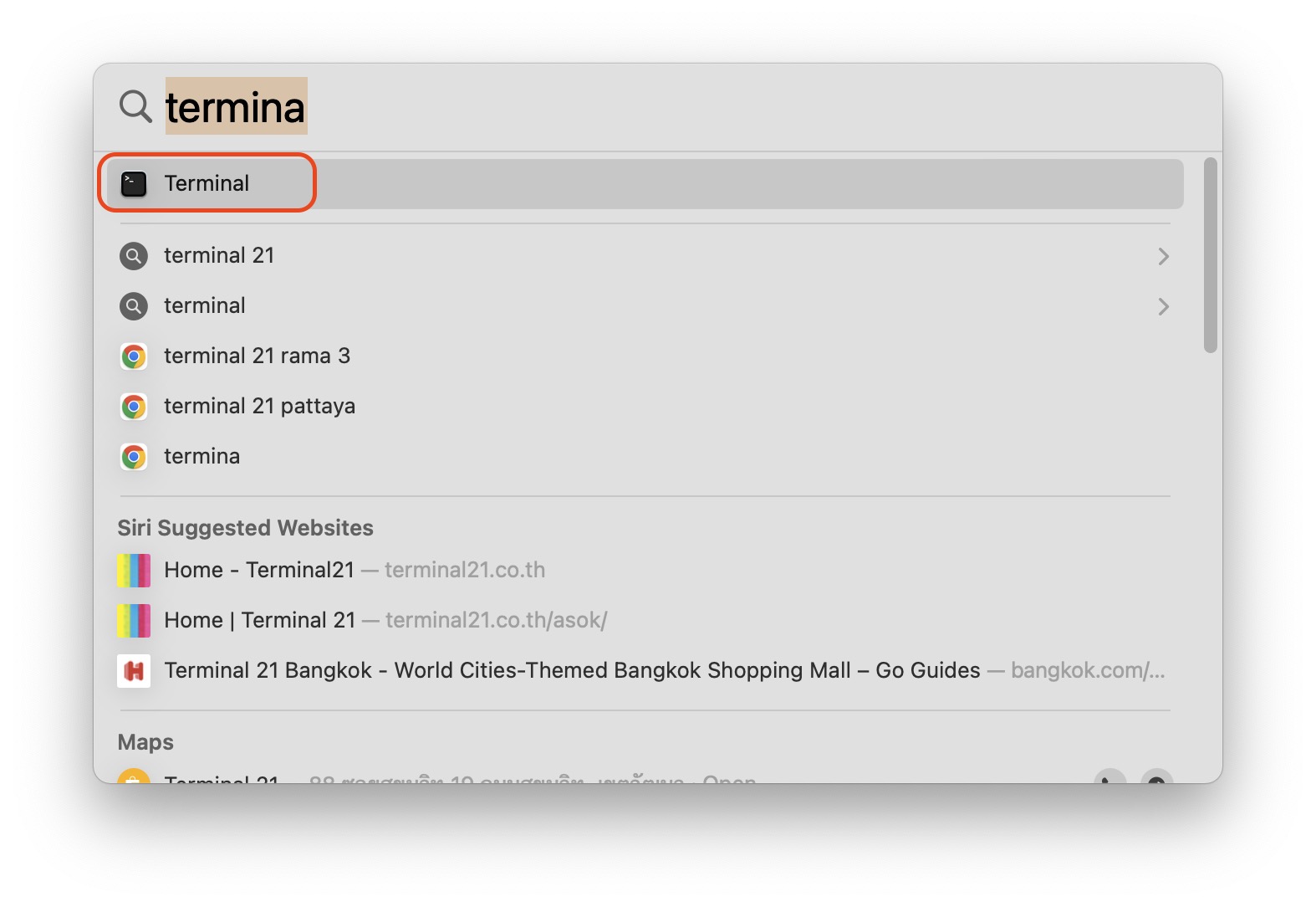 วิธีการเพิ่มนั้น เราจะต้องใส่คำสั่งลงไปใน Teminal สามารถเปิด Terminal ได้โดยการค้นหาใน Spotlight Search