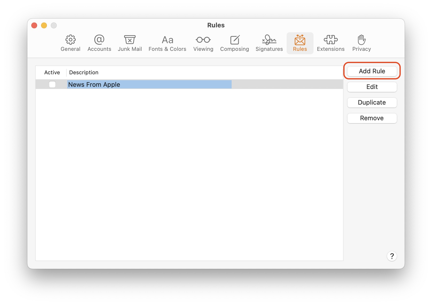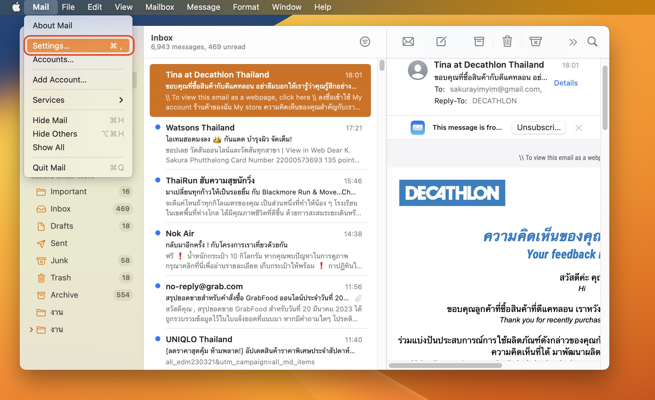 การตั้งค่า เราจะต้องไปตั้งค่า Rule ของอีเมลก่อน ไปที่แอป Mail คลิกเมนู Mail ด้านบน > เลือก Settings…