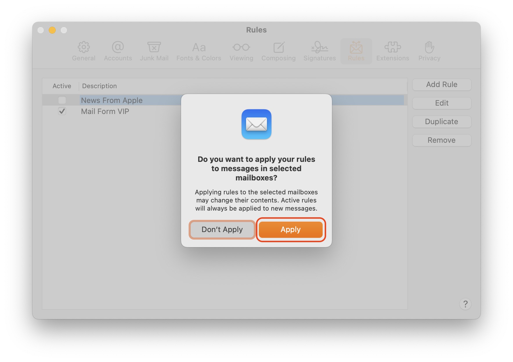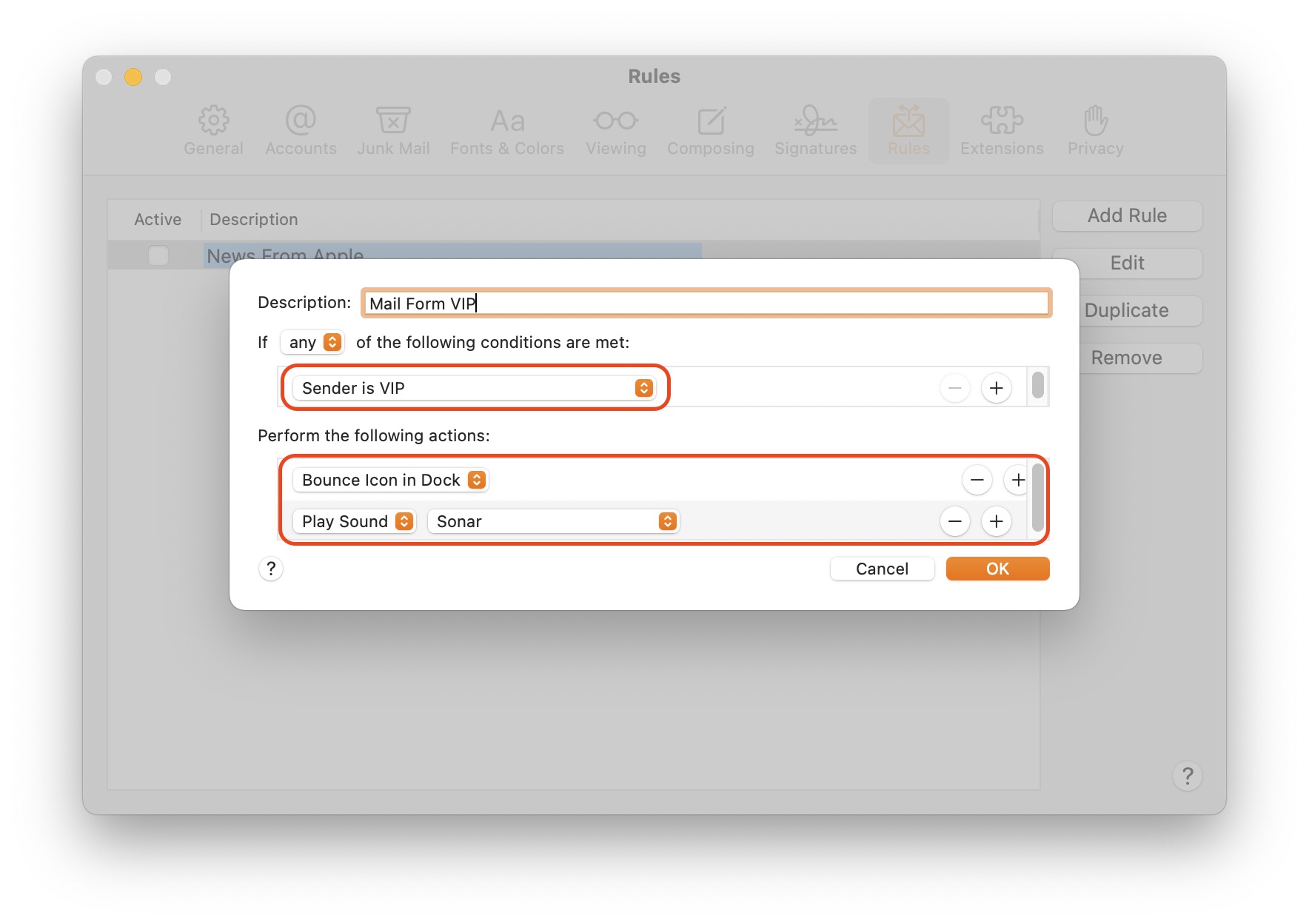 ใส่คำอธิบายให้เข้าใจง่าย > เลือกเป็น Sender is VIP > ด้านล่างให้กำหนดการทำงาน ตัวอย่าง กำหนดว่า เมื่อผู้ส่ง VIP ส่งอีเมลเข้ามา ไอคอนแอปบน Dock จะเด้ง และเล่นเสียง Sonar ซึ่งจะแตกต่างกับการแจ้งเตือนอีเมลจากผู้ส่งคนอื่น
