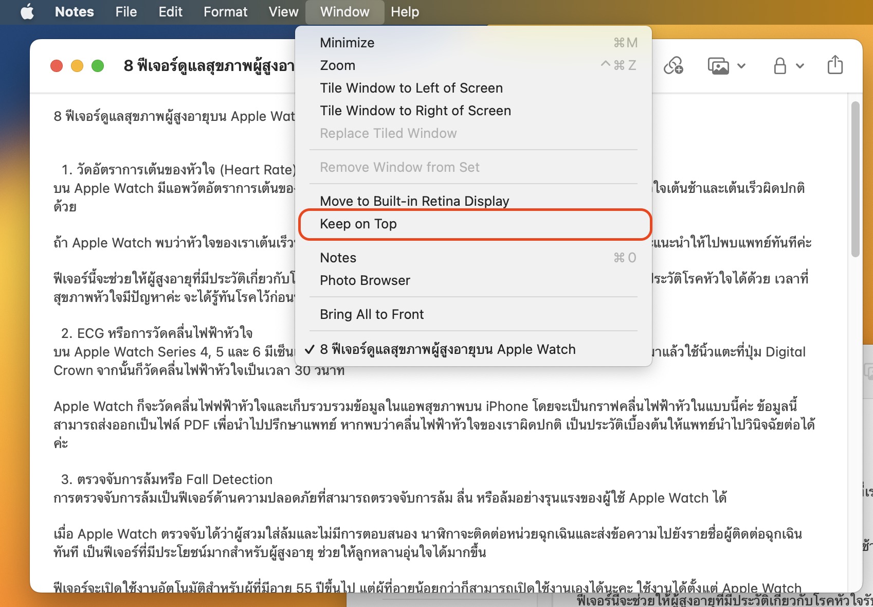 8. ตั้งค่าให้โน้ตแสดงเป็นหน้าต่างด้านหน้าสุด