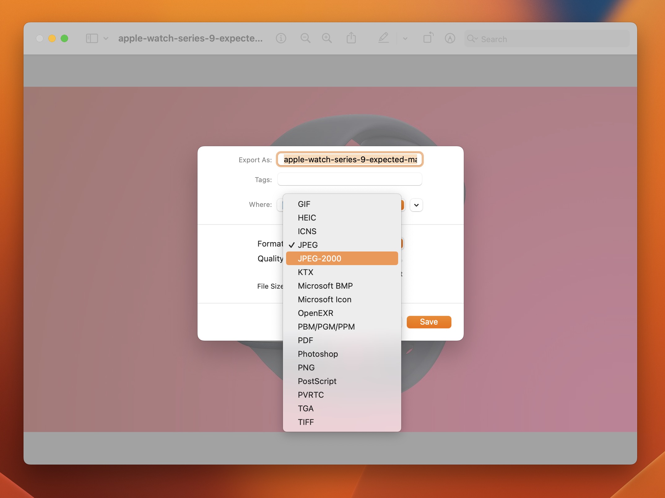 หากเราเปิดเอกสารหรือรูปภาพด้วยแอป Preview เวลาที่เราบันทึกหรือส่งออกไฟล์ (Export) เราสามารถกดปุ่ม Option และเลือกที่รูปแบบ (Format) ไฟล์ เพื่อเลือกประเภทนามสกุลไฟล์อื่น ๆ เพิ่มเติมได้